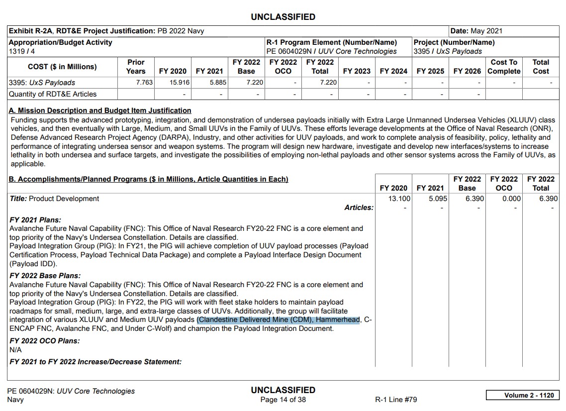 The Navy is also developing another air-dropped mine called Hammerhead to replace the Mk 60 Encapsulated Torpedo which is intended to lie in wait for months at a time after being deployed. The Clandestine Delivered Mine (CDM), a shadowy system believed to be in the prototype phase and intended for deployment aboard large unmanned underwater vehicles (UUVs), reportedly finished testing last year.