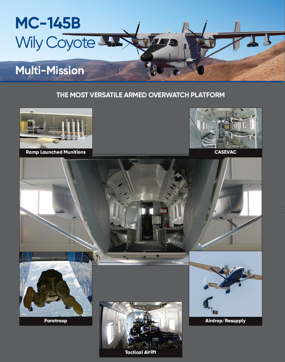 All of these could easily be points in the MC-145B’s favor during the Armed Overwatch trials, which SOCOM has said will evaluate the ability of the selected aircraft to operate from austere locations, demonstrate appreciable range and endurance, and show off a variety of ISR, munitions, and communications and data-sharing capabilities. The reconfigurable nature of the Wily Coyote could be particularly attractive given the plan for the Armed Overwatch program is for the winning design to replace AFSOC’s existing single-engine turboprop U-28A Dracos, which have relatively robust ISR suites and a secondary ability to operate as light transport planes, if required. AFSOC also continues to operate C-145As in a light transport configuration, primarily now to support training engagements with foreign allies and partners.