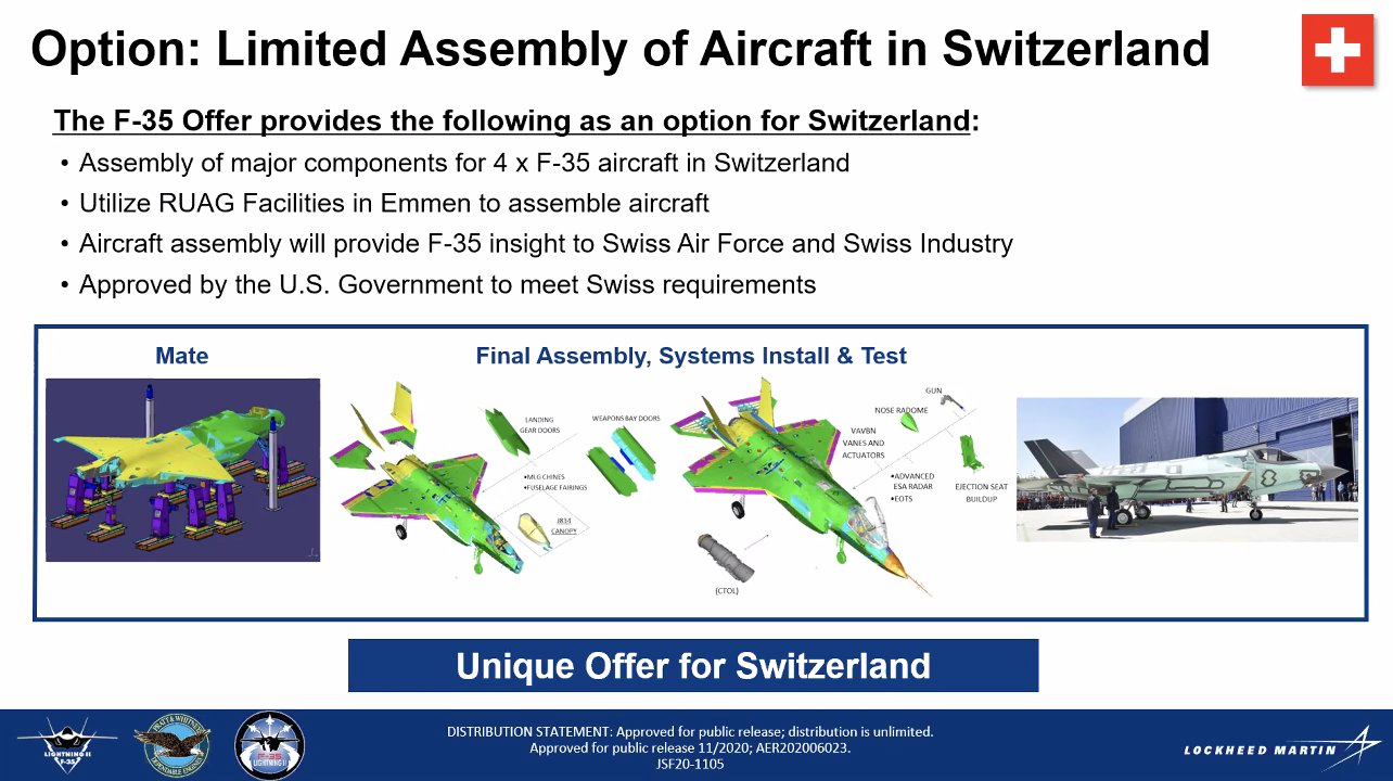 The one category where the F-35A failed to come out on top was direct offsets, although all entrants were required to provide offsets worth 60 percent of the order value within four years of the final delivery. In the past, as seen in the slide below, Lockheed Martin offered Switzerland the option to undertake “limited assembly” of four F-35s locally, but it’s not clear if this has been taken up.