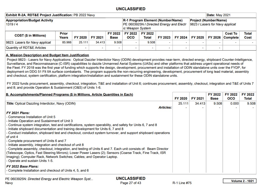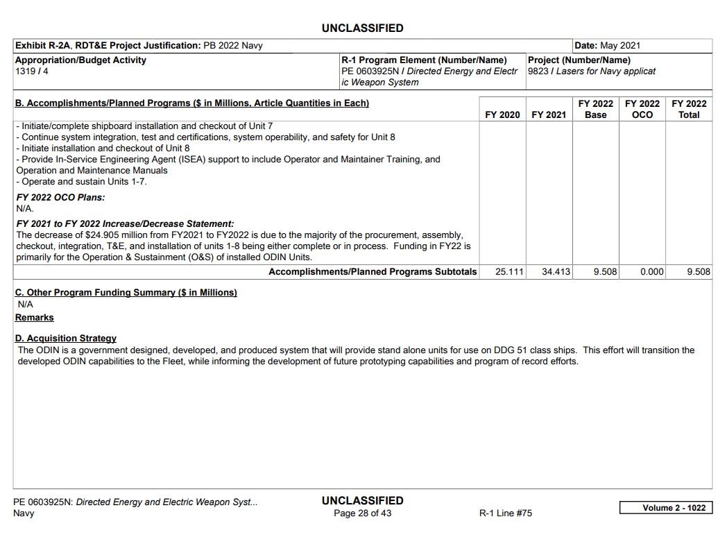 The Navy has requested $9.5 million for ODIN in its FY 2022 budget documentation, down from $34 million in 2021. The Navy’s budget requests state that the decrease is due to the fact that “the majority of the procurement, assembly, checkout, integration, T&E, and installation of units 1-8 being either complete or in process,” noting that “Funding in FY22 is primarily for the Operation & Sustainment (O&S) of installed ODIN Units.”