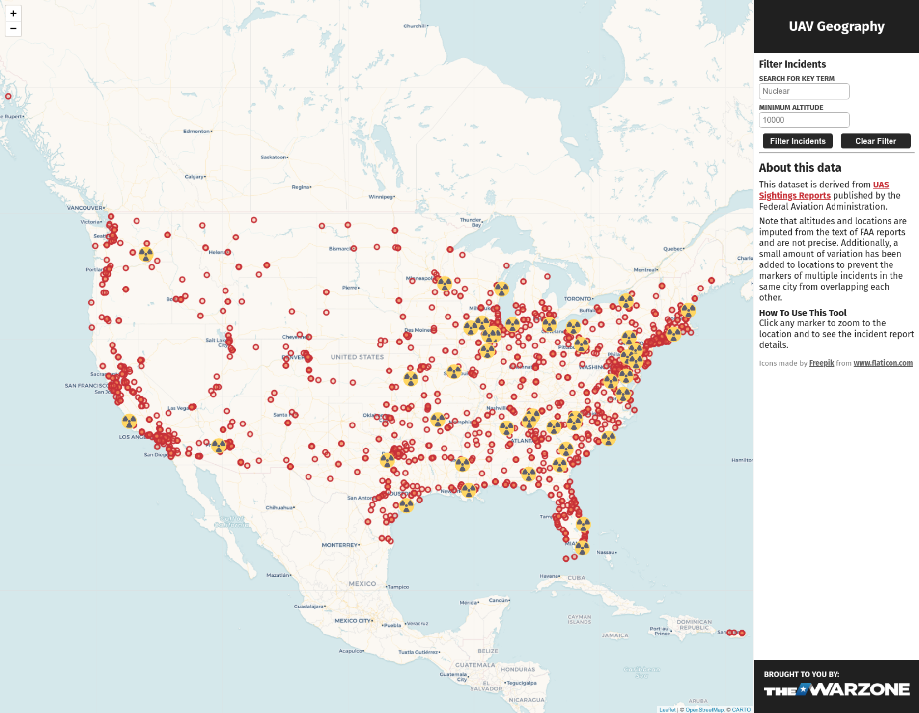 , Federal Aviation AdministrationThe UAS Sightings Report data span from November of 2014 until December 2020. We have standardized and joined these spreadsheets together into one consolidated resource. Although the reports do not include precise location information, we have been able to assign approximate locations using the city and state information provided. Importantly, we have introduced a small amount of randomness to the locations in order to prevent the incidents in the same city from overlapping each other on the map. Please note that the location on the map does not correspond precisely to the location of the incident. In fact, based on our previous reporting, we have found that the actual location of the incident can be many miles from the city cited in the report.