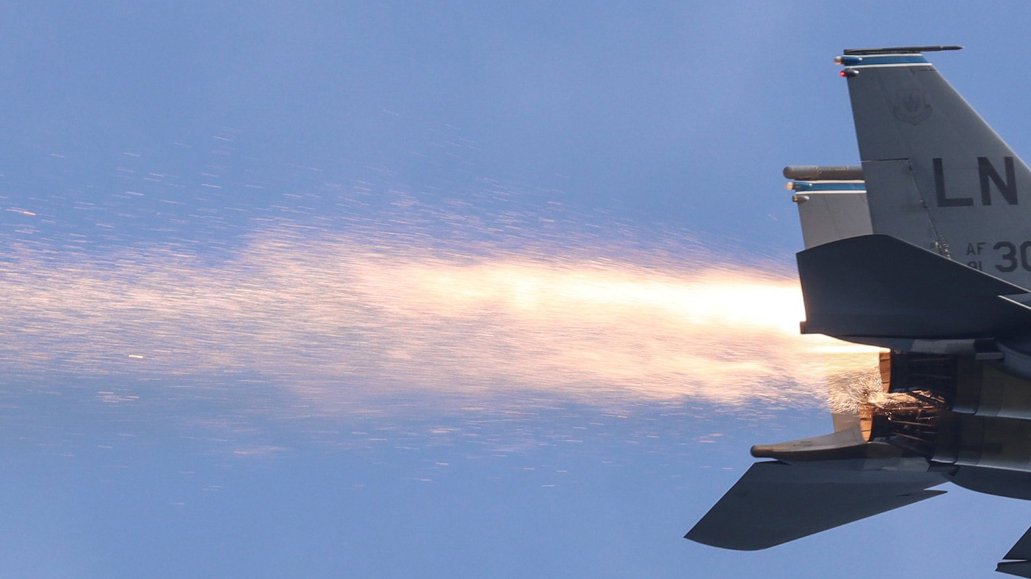 Unconfirmed reports suggest that the trail of sparks emitted from the F-15E’s right-side Pratt & Whitney F100 turbofan was caused by a broken nozzle petal and actuator.
