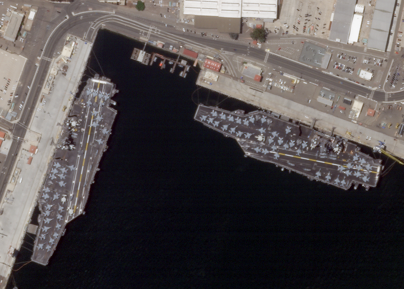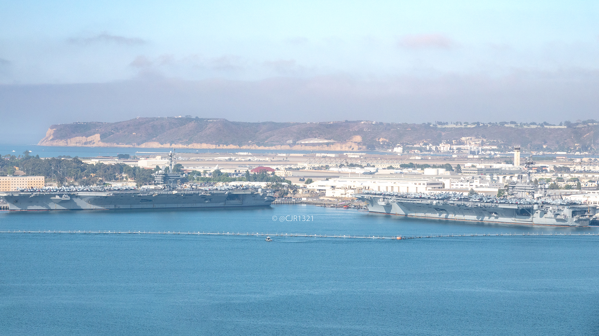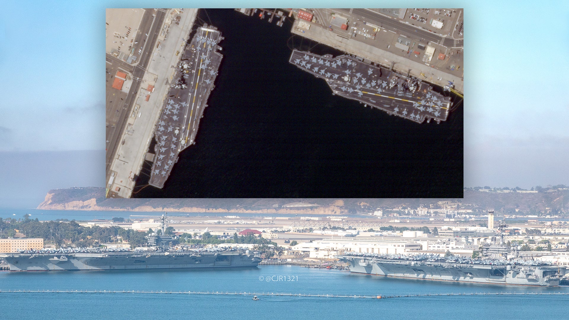 USS Carl Vinson (CVN-70) and USS Abraham Lincoln (CVN-72) are both currently docked at Naval Air Station North Island, which sits right across the bay from downtown San Diego. While it is not rare to see two, or even three, supercarriers in port at North Island, what is rare is seeing two of these massive warships sitting side-by-side with their entire air wings embarked. The terrestrial photos come to us courtesy of our friends @Warshipcam and @CJR1321.