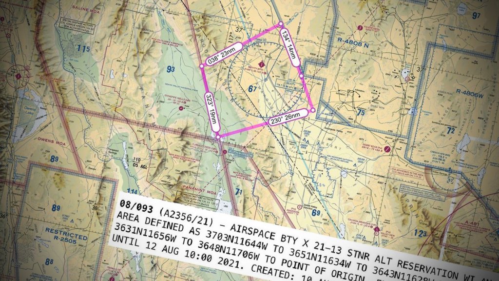 A somewhat bizarre airspace restriction will go into place above one of the busiest flight corridors in the western United States on Thursday, August 12th, from 11 pm to 3 am Pacific time. The box-like altitude reservation (ALTRV), a high-altitude chunk of airspace from 45,000 to 60,000 feet, sits nestled between military operating areas (MOAs) that are part of the R-2508 range complex that surrounds Edwards AFB and Naval Air Weapons Station China Lake to the west and the Nevada Test and Training Range (NTTR) to the east. This box of sky sits above an alley-like corridor that streams of airliners travel through coming and going from Las Vegas and other major population centers in America’s Southwest.
