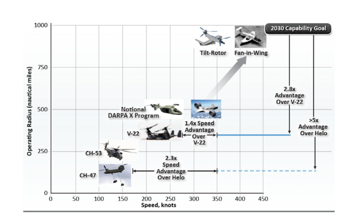 By the 1990s, the Osprey had entered flight testing as the first practical military tiltrotor aircraft, but U.S. plane-makers were still not able to field a functional HSVTOL design capable of true jet speeds. Nevertheless, studies and development initiatives continued in the decade that followed, with NASA and the Defense Advanced Research Projects Agency (DARPA) now taking a lead.