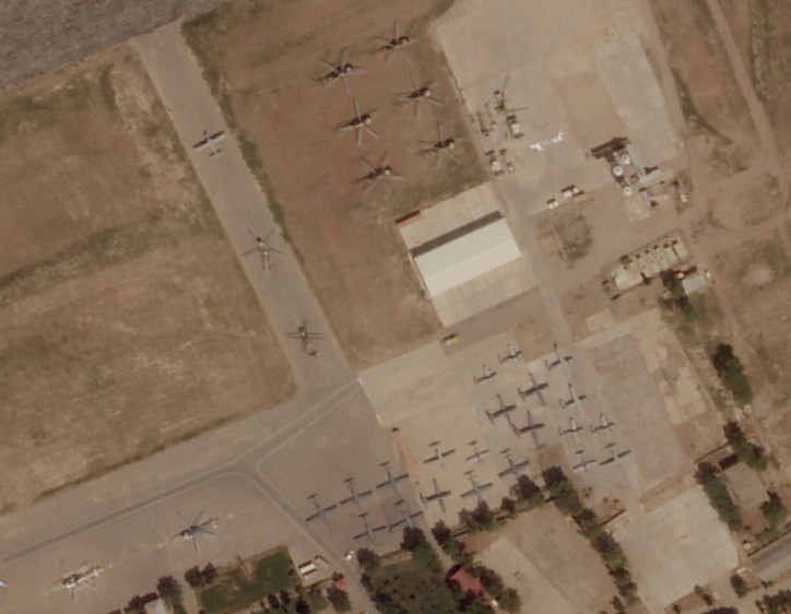 An image, taken yesterday, Aug. 16, 2021, of Termez from Planet Labs shows the sudden appearance of at least 22 small fixed-wing planes and 26 helicopters. The resolution of the imagery means we can’t say for sure that all of these aircraft came fled from Afghanistan. However, what we can see fits almost perfectly with an official statement from the government of Uzbekistan that 46 aircraft, 22 fixed-wing types and 24 helicopters, coming out of Afghanistan had been “forced” to land.