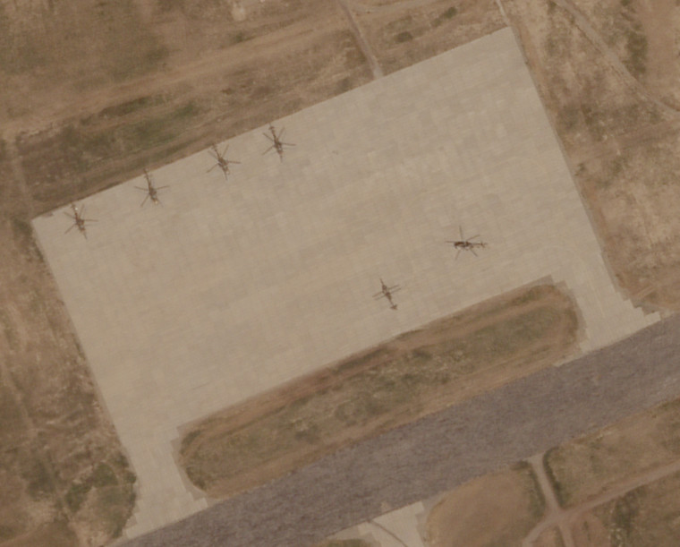 The helicopters look to be a mix of Mi-8/Mi-17 Hip and UH-60 Black Hawk transport helicopters, with what looks to be 19 and 7 of each type, respectively. There do not appear to be any of the late Afghan Air Force’s fleet of smaller Hughes 530F Little Bird armed scout helicopters now at Termez.