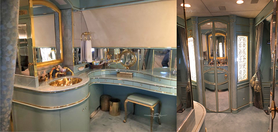 While that is an adequate description of the aircraft’s basic layout, it does not do its interior justice. The jet is elaborately adorned in what looks very much like Tiffany Blue with gold accents. Its lavatory bathroom looks more like what you would find in a five-star Parisian hotel than on an aircraft. In fact, its interior design looks remarkably timeless considering it is two decades old and likely cost its own fortune when originally installed.