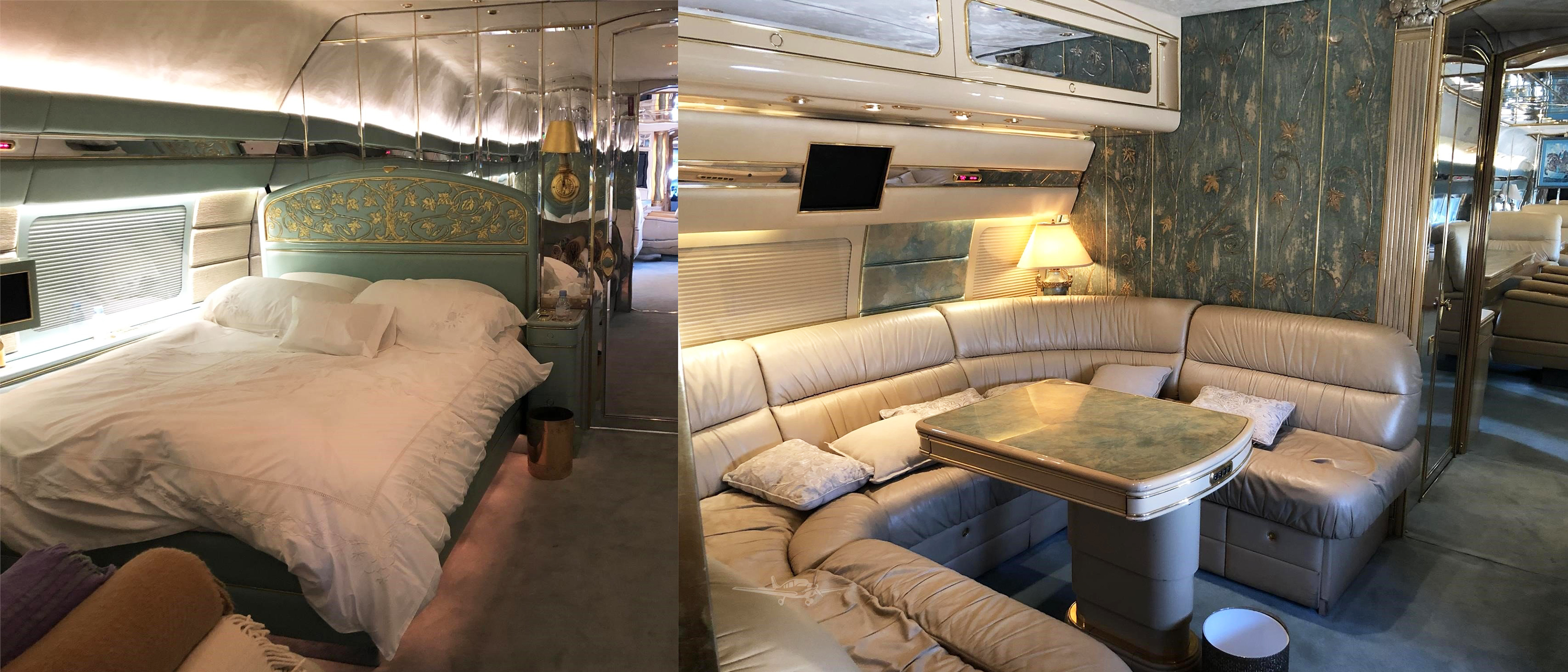 Aircraft was completed by Ozark Aircraft Systems in USA in 1999-2000. The interior layout can accommodate 25 VIP passengers and consists of an entrance/vestibule area, forward staff area, forward lounge, main lounge and master stateroom. There are 2 forward galleys, one forward lavatory and one aft lavatory.
