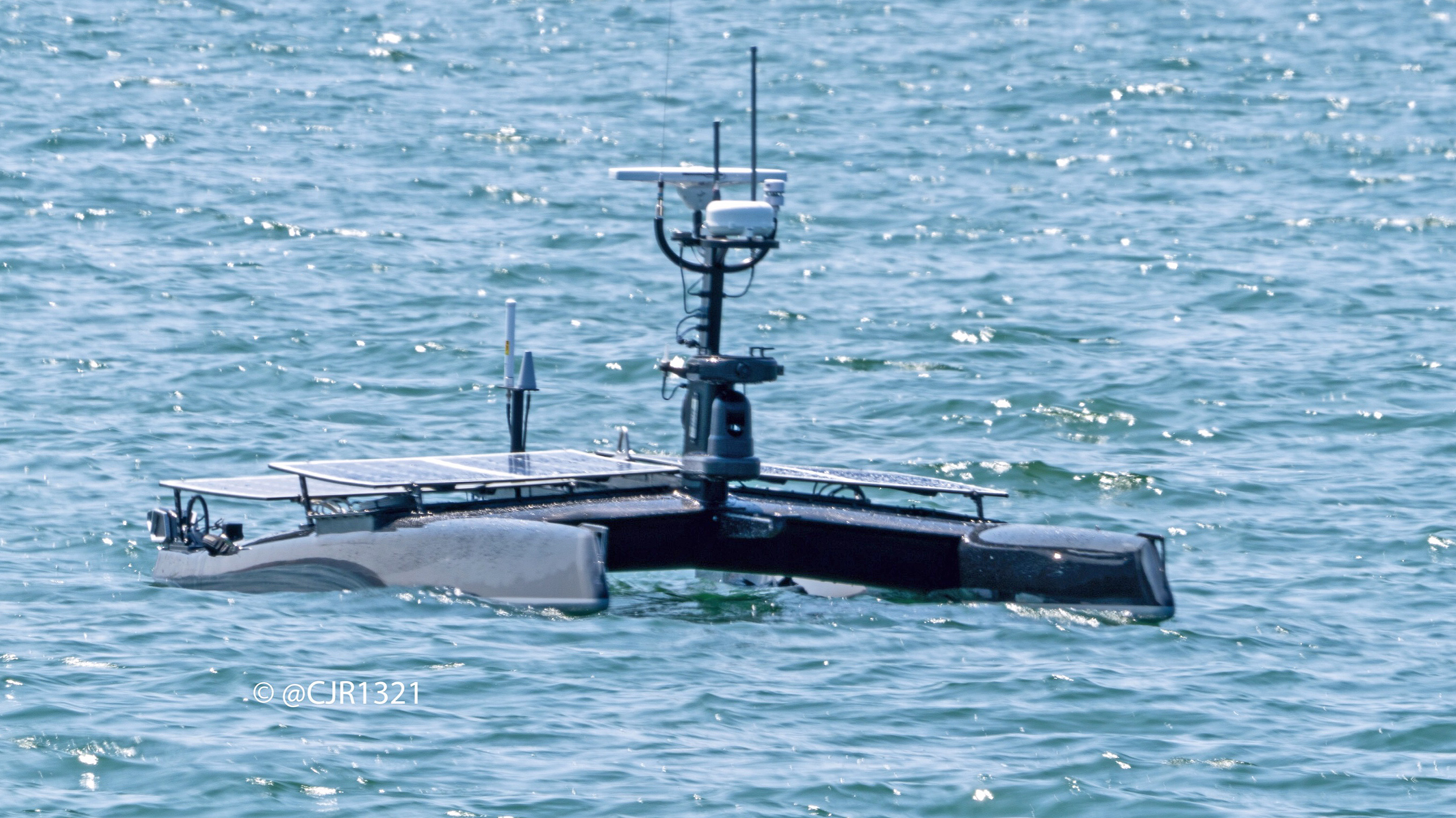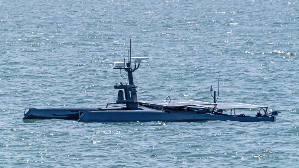 As @WarshipCam points out in the tweet above, the unmanned surface vehicle in question was dubbed Catbus on MarineTraffic.com. As you can see, the little catamaran includes large solar panels and a host of antennas, radar, as well as what looks like possibly a small FLIR ball mounted in front of its mast. A flat, puck-like enclosure above the FLIR appears to also include fixed cameras for situational awareness and navigation purposes.