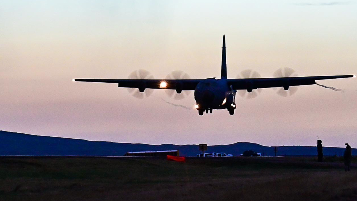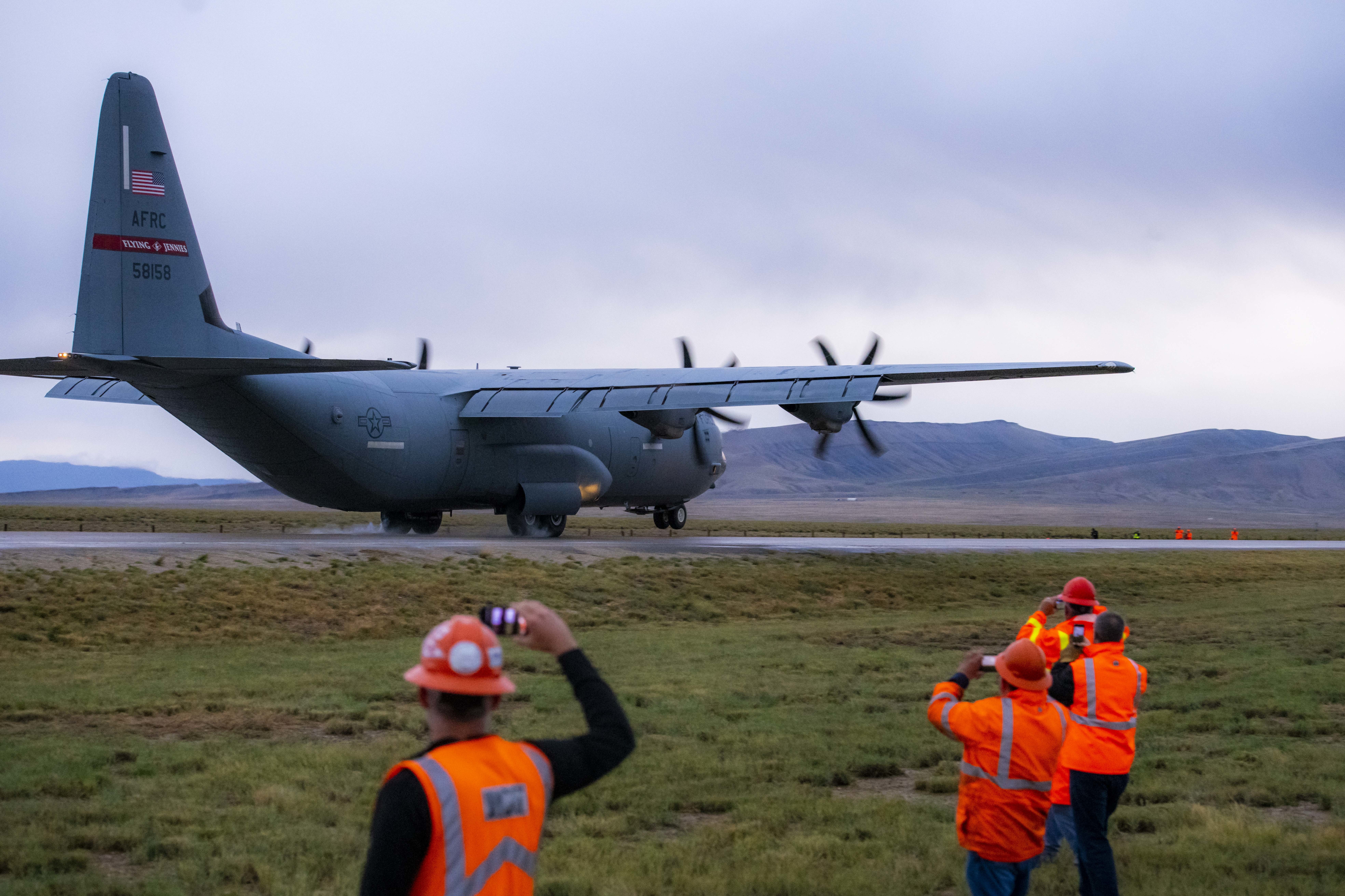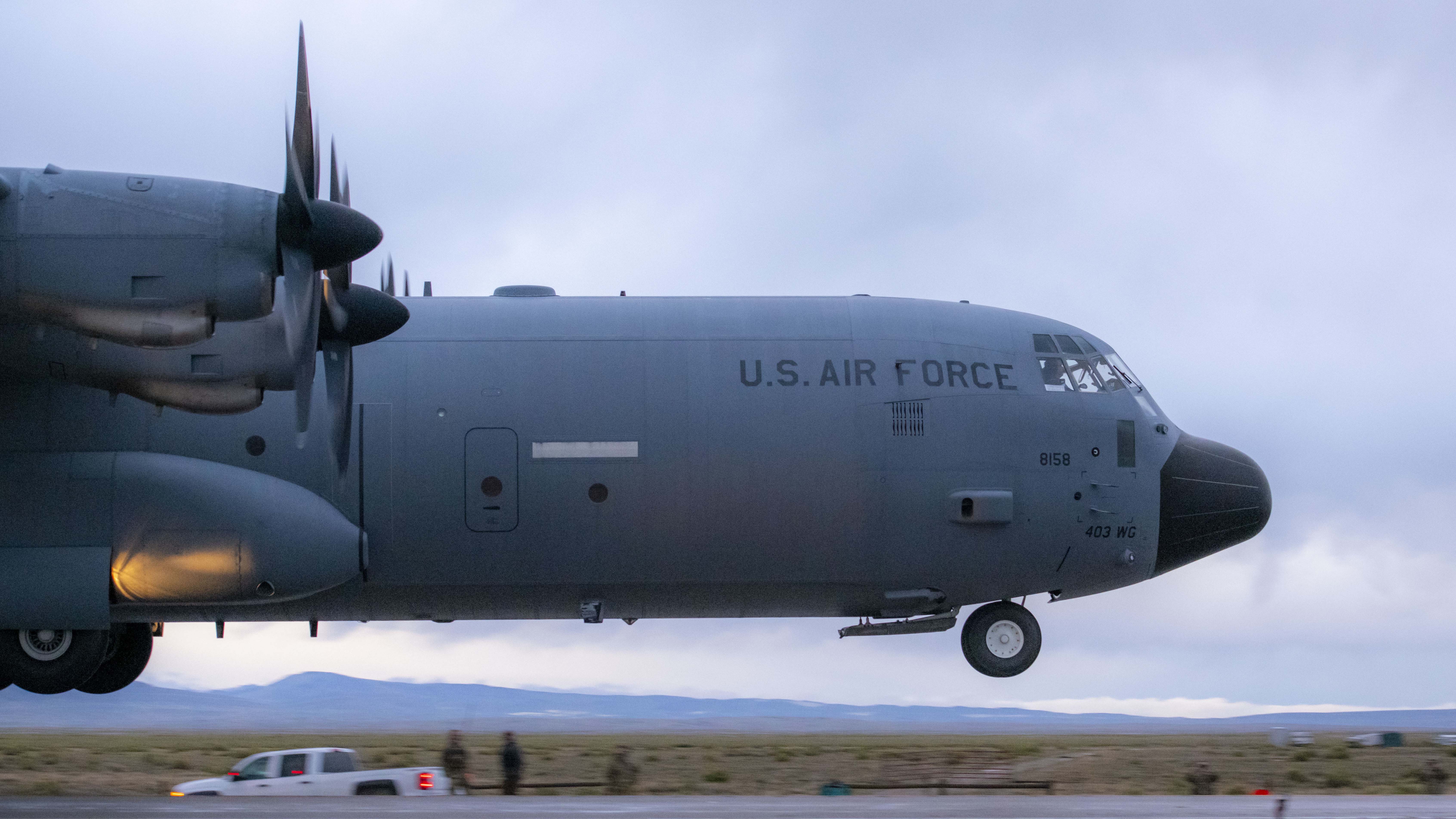 The C-130J highway landing was part of the Air Force Reserve Command’s larger, week-long Rally in the Rockies exercise and took place on U.S. Route 287, north of Rawlins, Wyoming, for around three hours on the early morning of September 13, 2021. This required the public road to be closed off by the Wyoming Department of Transportation to allow safe operations by the four-turboprop transport, while the local surroundings stood in for enemy territory.