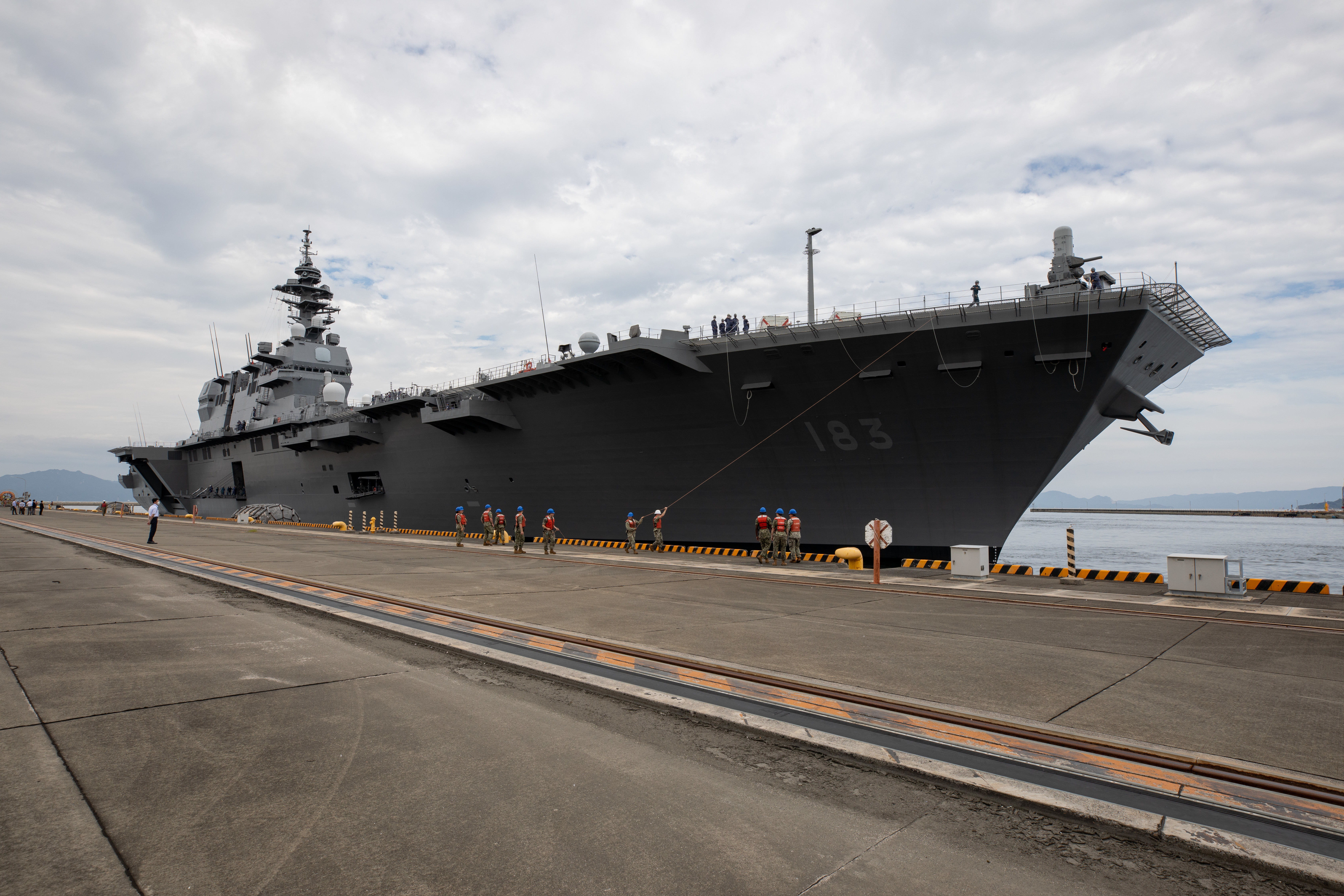 The warship, lead vessel in a two-ship class, was completed as a helicopter carrier, with provision initially only for the operation of rotary-wing types, including tiltrotors. However, the possibility of operating fixed-wing aircraft was also in mind when Japan originally ordered the two vessels, the country’s largest warships since the end of World War II.