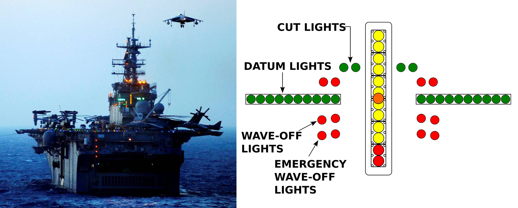 For approaches where we use the ball, yep the ball call is the same. There are a couple of extra calls related to the vertical landing that occur after the ball call. For a normal daytime good weather recovery, we just call abeam, no ball call. And then similar to how a CVN LSO [Landing Signal Officer] provides guidance, the V/STOL [Vertical/Short Take-Off and Landing] LSO does the same, but again with some specialized terminology related to the hover and vertical landing.