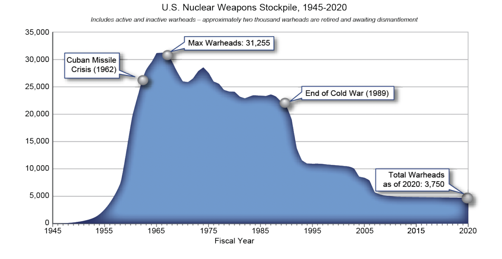 The fact sheet also compares the latest total to the peak of the U.S. nuclear weapons stockpile — 31,255 warheads in Fiscal Year 1967 — and the total at the end of the Cold War — 22,217 in late 1989.