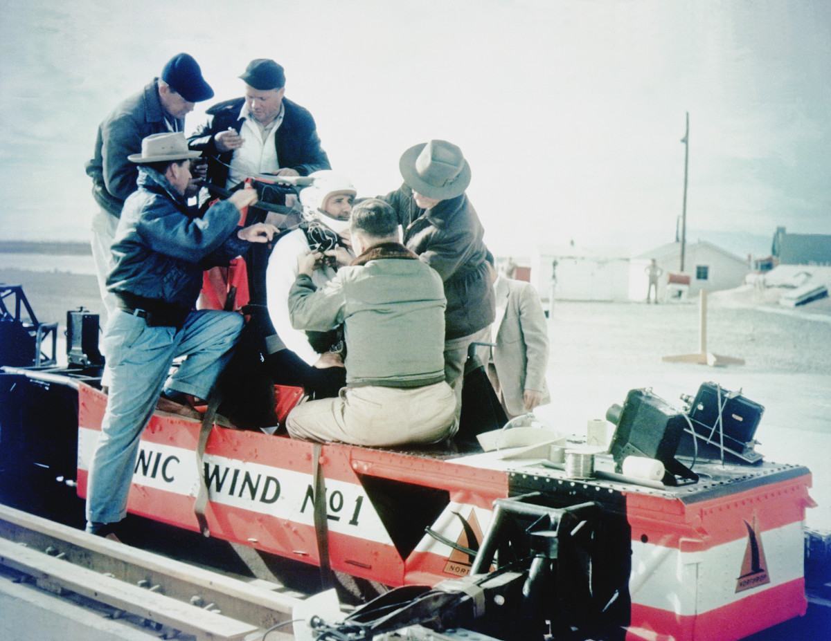 A test that took place on Dec. 10, 1954, is by far the most famous of the work done at the track in the 1950s. On that date, Air Force Lieutenant Colonel John Stapp was strapped into a metal chair on a rocket-powered sled, dubbed Sonic Wind No. 1, and blasted down the track. The sled hit 630 miles per hour and Stapp was subjected to 40 Gs of force during the ride, leaving him with broken ribs and a detached retina among other injuries.