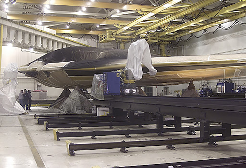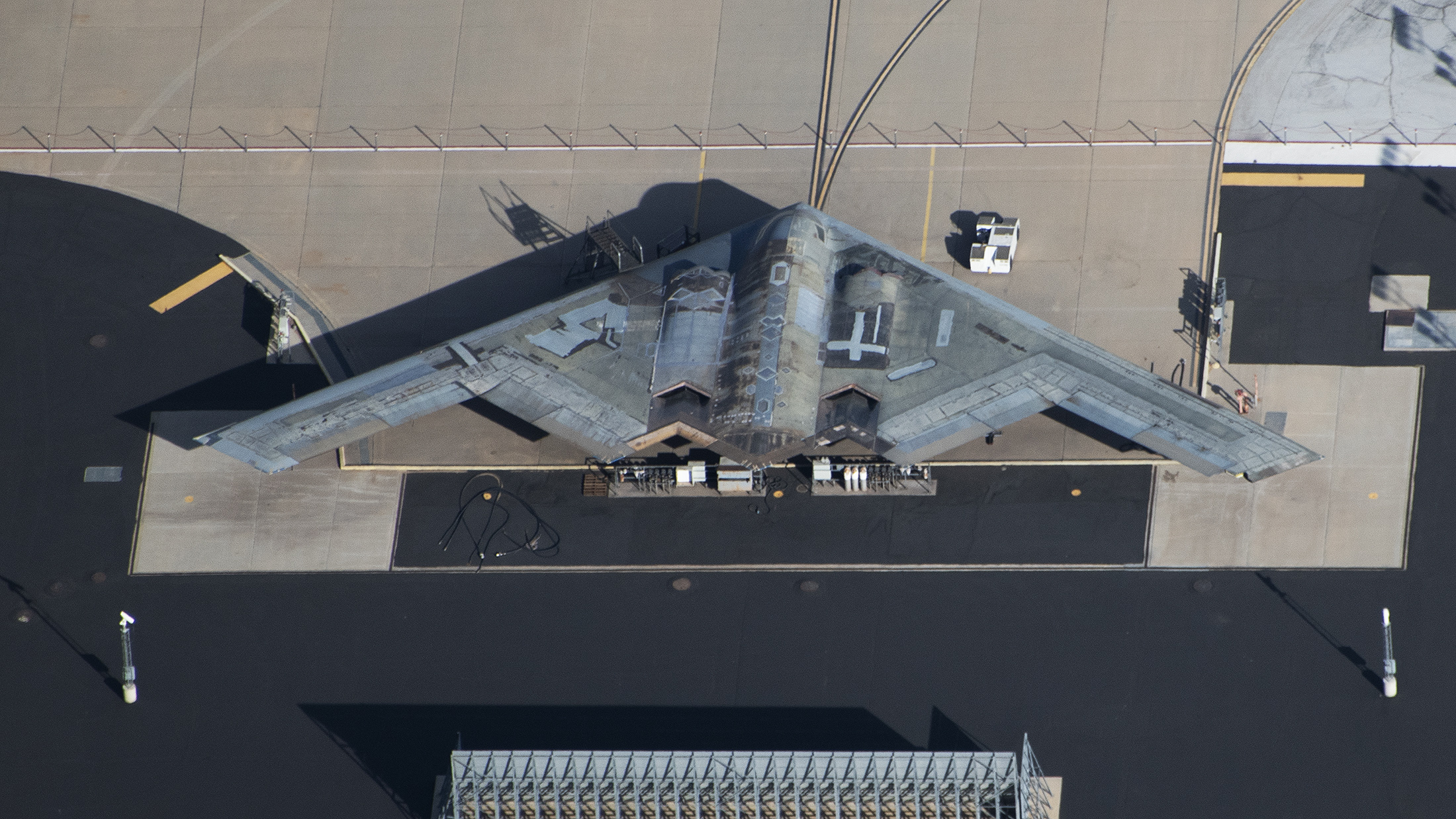 With that all being said, Plant 42 is where we find one of the remaining 20 B-2s. One of these bombers was recently damaged during a landing incident, although it is very unlikely to be the airframe we see at the facility in Palmdale. This aircraft was spotted by a private pilot transitting the area. They sent us some photographs of one of the Spirits sitting out on the ramp in its deep maintenance slumber. As you can see in the shots, the jet has been at least partially stripped of its coatings and some of its radar attenuating parts as it awaits the next step in its overhaul process. It’s a fascinating study in seams, embedded antennas, and patina of an aircraft that is at least nearly 25 years old by now—the last B-2, the Spirit of Louisiana, was delivered in 1997.
