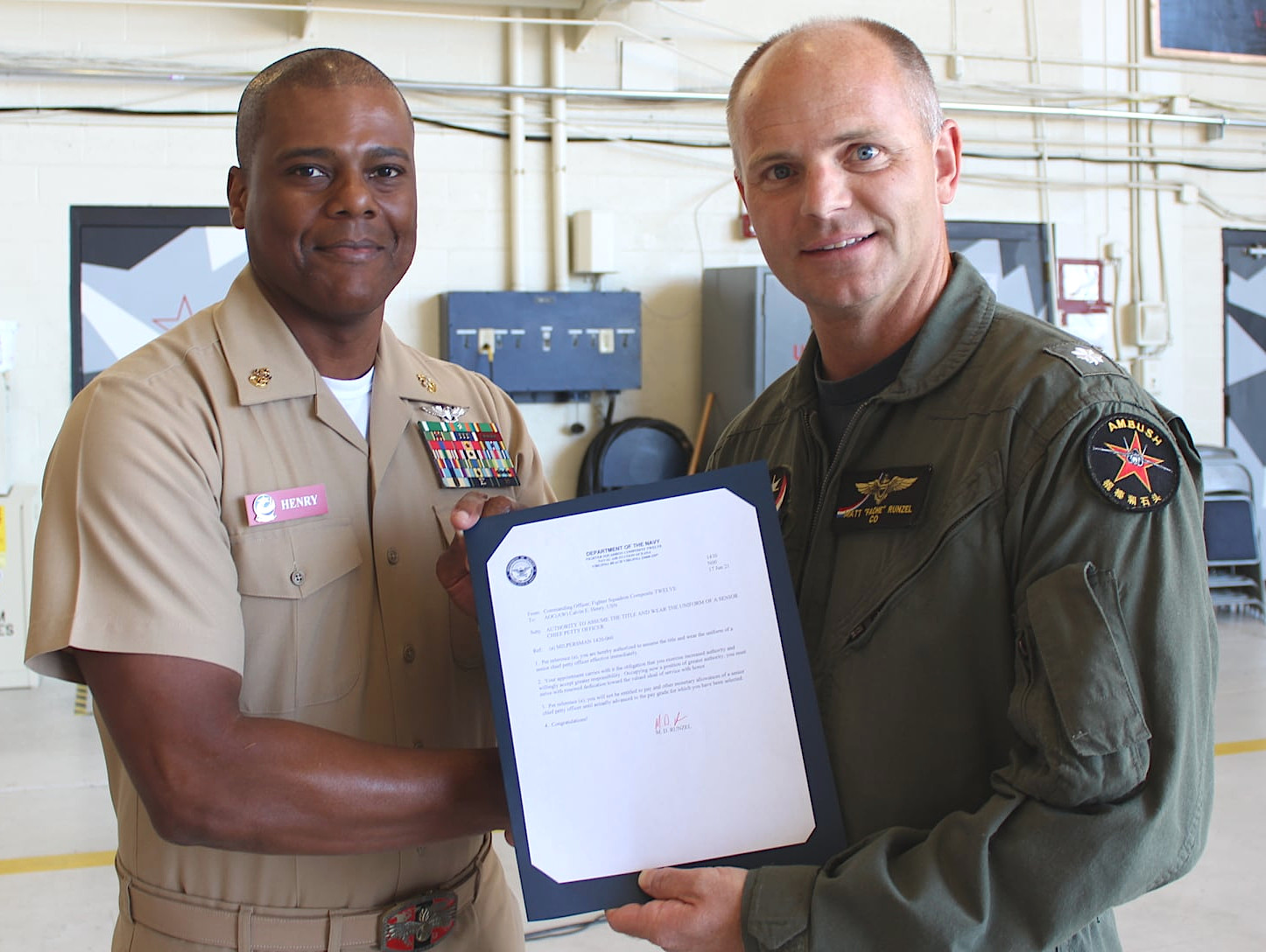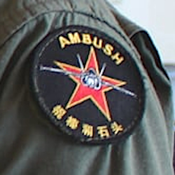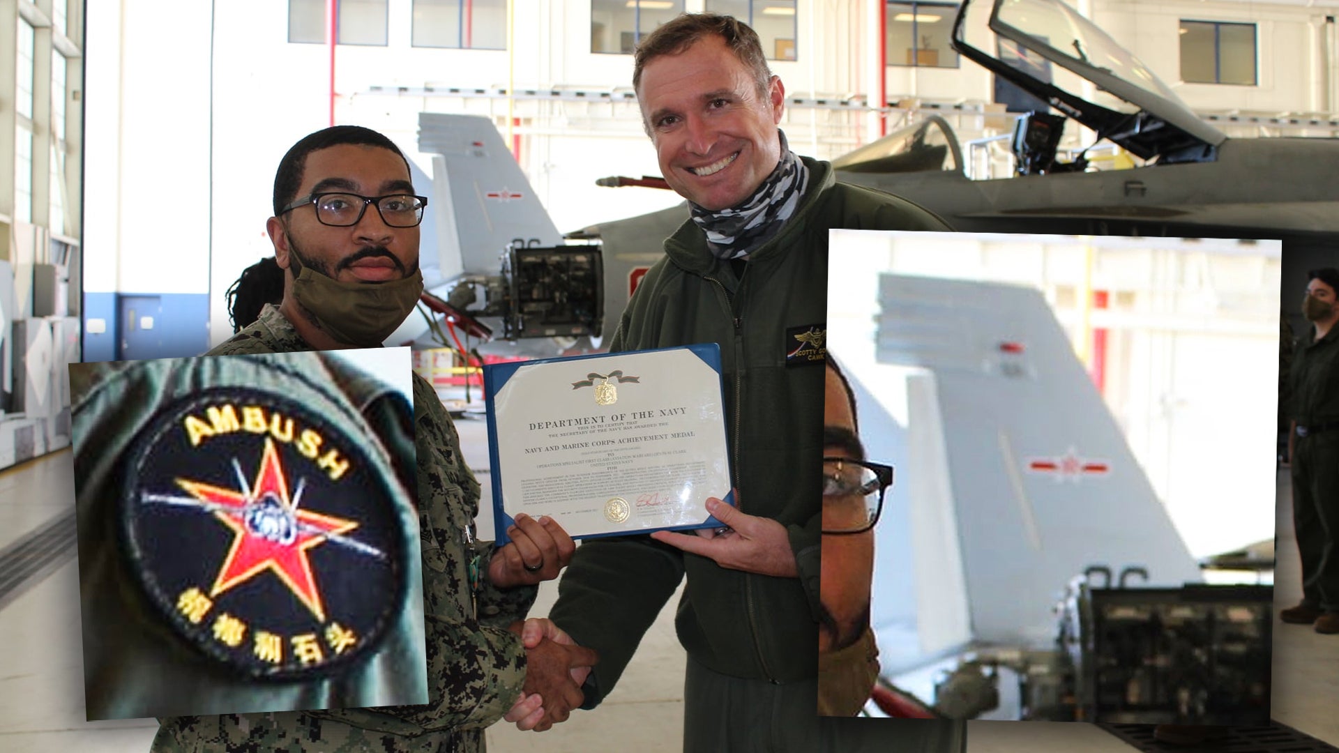 The impact of all of this on VFC-12’s day-to-day activities was already apparent earlier this year at a similar awards event. The squadron’s previous commanding officer, Cdr. Matt Runzel, handed out certificates while wearing an interesting patch, seen below, featuring a Hornet, viewed from the front, on top of a red star, along with “AMBUSH” written at the top. While plain red stars are more typically associated with the Soviet and Russian militaries, the patch also has an unknown phrase in Chinese characters written at the bottom.