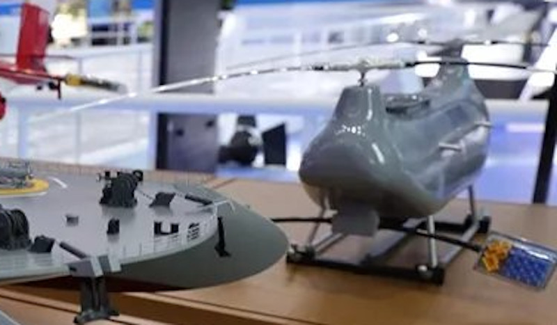 The model of the vessel at Zhuhai depicted it carrying five relatively small tandem-rotor drone helicopters on a large open foredeck in front of the main superstructure. In addition, it showed multiple large antenna domes, which might be associated with high-bandwidth communications systems that would be useful for controlling large groups of unmanned helicopters. The domes were mounting on a large tower on top of the superstructure that would offer a very good location just for positioning line-of-sight control links.