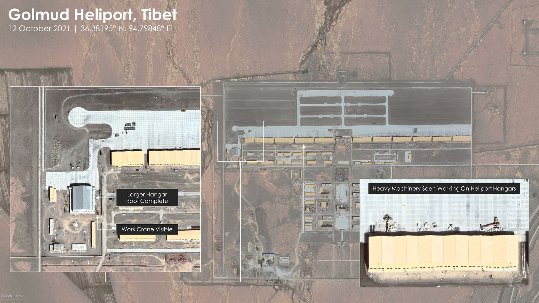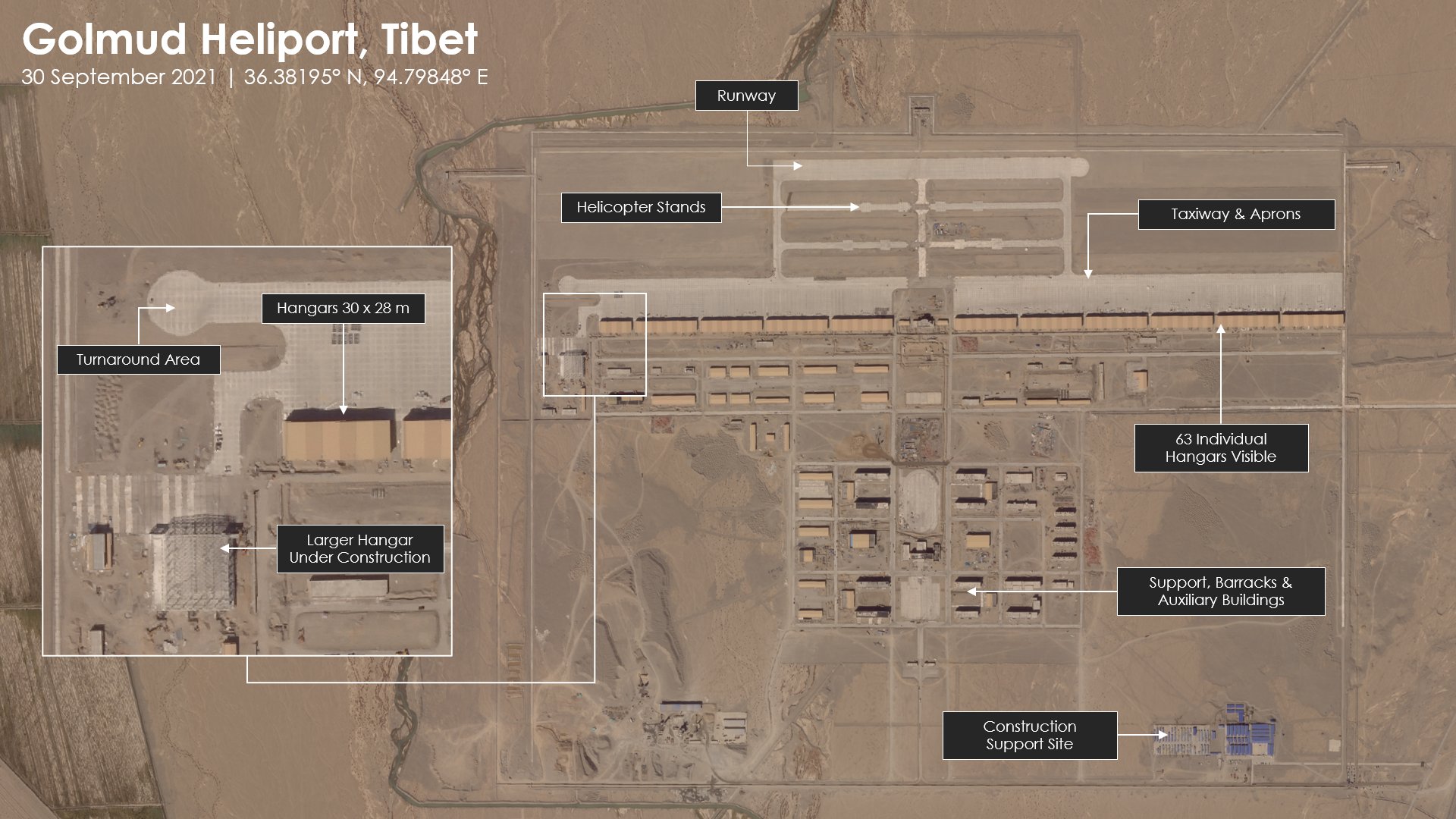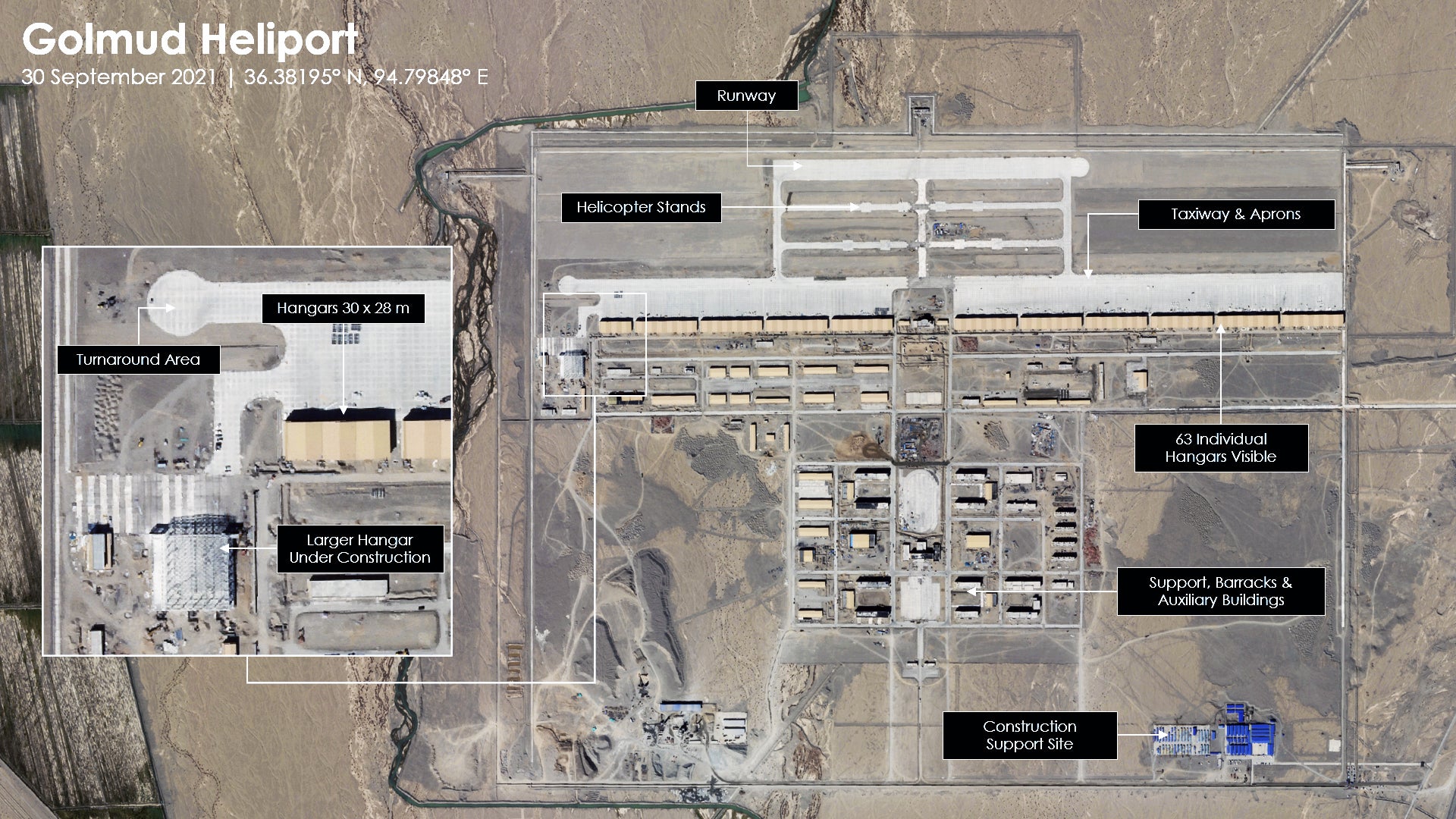 In Golmud, on the northern edge of the plateau, a behemoth heliport can be seen under construction south of its existing airport. A total of 63 individual hangars are visible along with the construction of barracks and support buildings. A review of past satellite imagery indicates the site began construction in early 2020 and has almost reached completion. Golmud is situated in an area that was historically part of Tibet, but that is currently situated in the Haixi Mongol and Tibetan Autonomous Prefecture of China’s Qinghai Province.