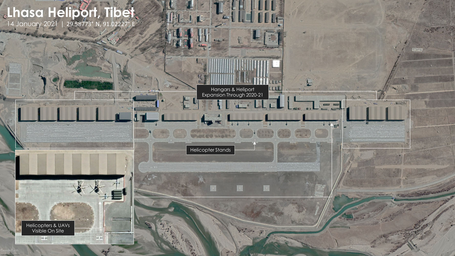 We have also noticed renovations and expansion activity at older pre-existing heliports such as the one in Lhasa, which is located in one of the most populated urban areas of Tibet. The heliport has seen new hangars being constructed along with the deployment of UAVs indicating a multi-purpose role to the structure.