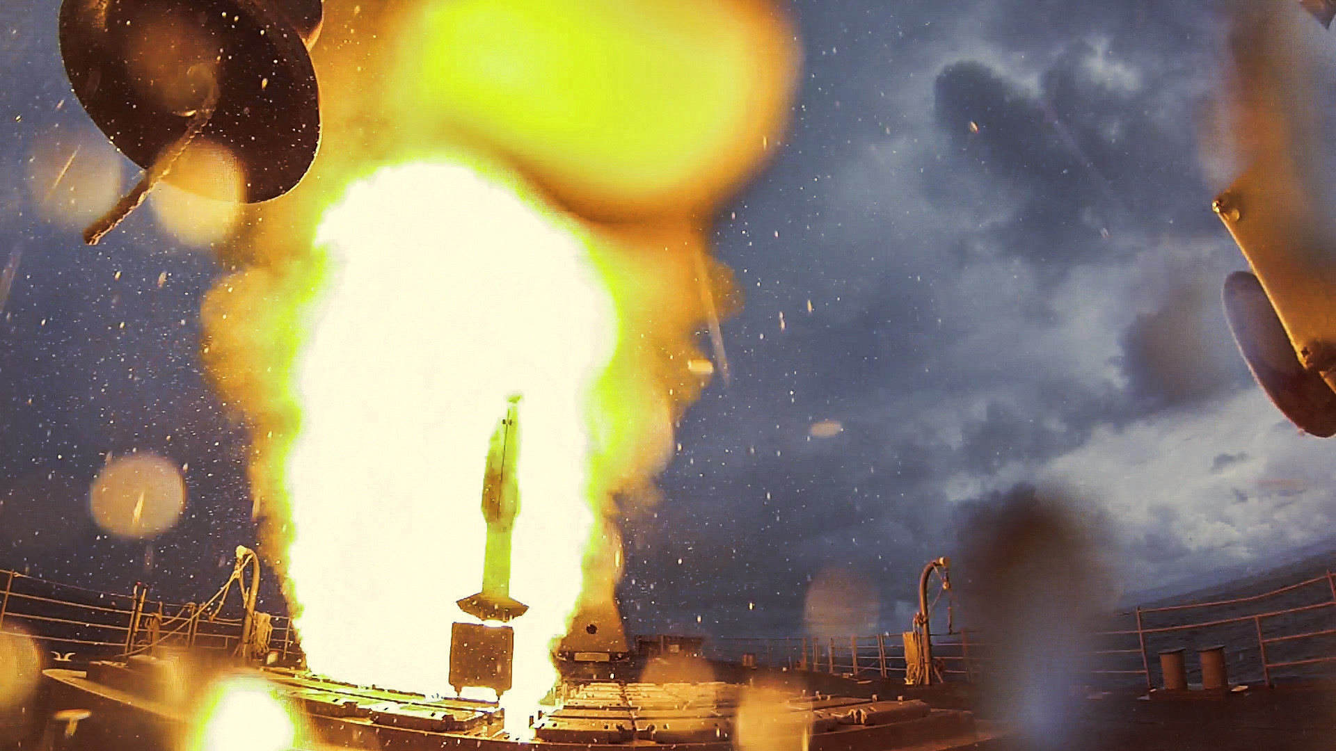 From the outside, the building doesn’t look like much — until the whole structure actually starts to move backward. What gets exposed after the building moves is a giant maneuverable laser emitter. There are several missile- and drone-kill markings on it, signifying what this thing has brought down in testing.
