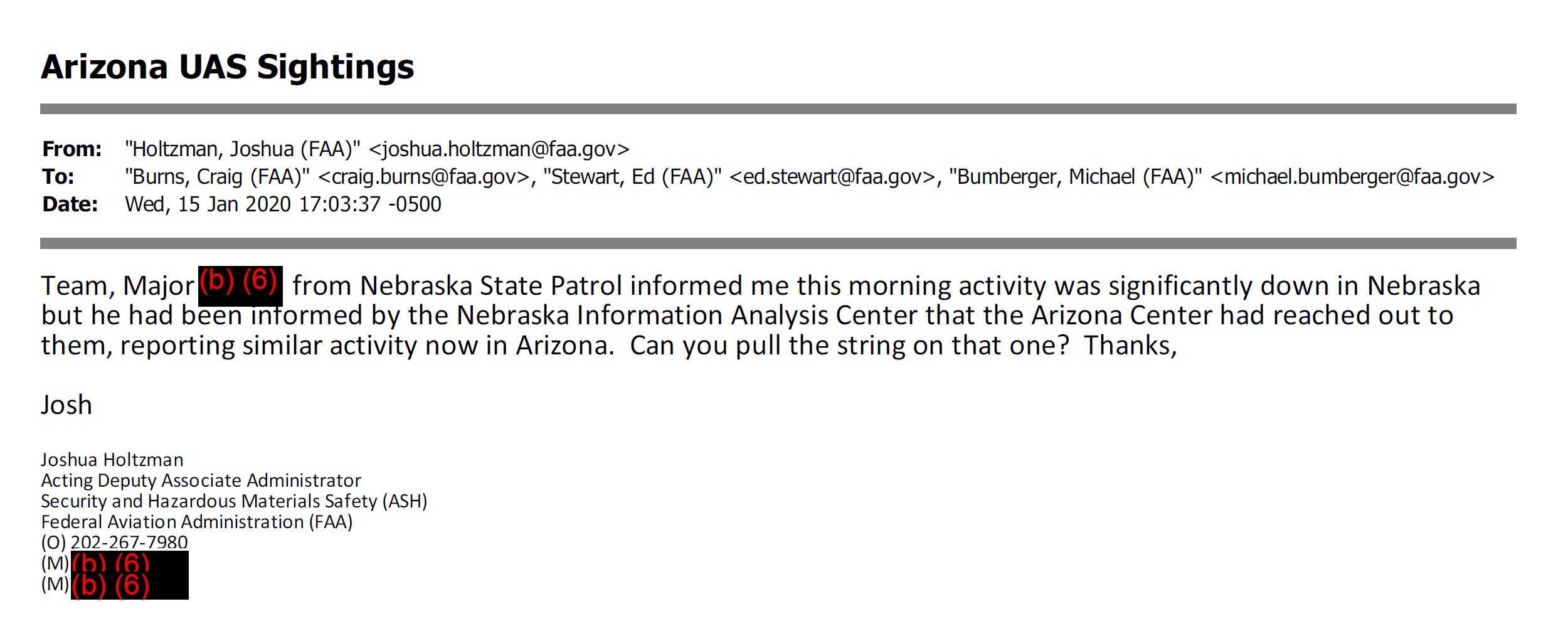 In our reporting related to the Colorado and Nebraska mystery drone flap of late 2019, friend of The War Zone Douglas D. Johnson obtained internal FAA emails between Joshua Holtzman, serving then as Acting Deputy Associate Administrator for the FAA’s Office of Security and Hazardous Materials Safety, and other employees of the FAA. In an email dated January 15, 2020, an individual with a Nebraska.gov email address whose identity has been redacted stated to Holtzman that “it appears Arizona may now be experiencing what we went through.” Holtzman shortly after wrote to other FAA investigators to state that “Nebraska State Patrol informed me this morning activity was significantly down in Nebraska but he had been informed by the Nebraska Information Analysis Center that the Arizona Center had reached out to them, reporting similar activity now in Arizona.”