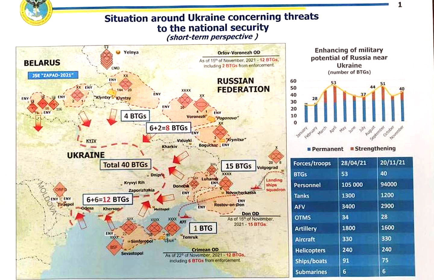 The scenario outlined in the slide Budanov gave to Military Times shows the total Russian force consisting of around 40 “battalion tactical groups,” or BTGs, which can have between 700 and 900 total personnel, each. This would put the total size of the force at between 28,000 and 36,000 troops. The maps show a mixture of armored, mechanized infantry, and airborne infantry BTGs. Satellite imagery, as well as pictures and video taken on the ground in recent weeks, show significant amounts of heavy armor, self-propelled artillery, and even Iskander short-range ballistic missiles now in the region.