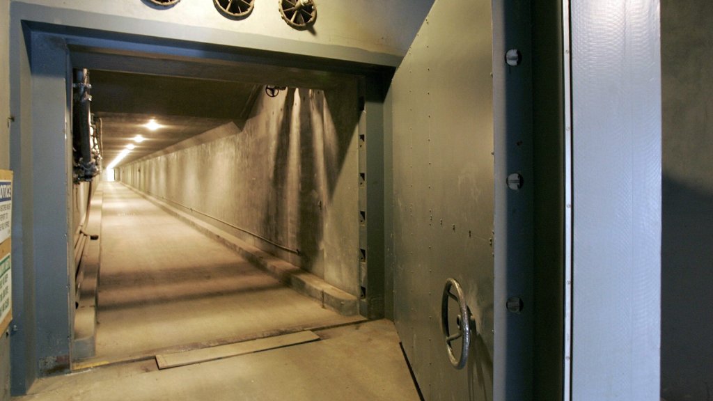 “The West Tunnel Blast Door, which weighs 25 tons and serves as an entrance to a former government relocation facility, also know as the bunker, is seen during a media tour at Greenbrier Resort July 14, 2006, in White Sulphur Springs, West Virginia. The bunker, codenamed ‘Project Greek Island’ and planned by the Eisenhower administration, was a 112,000 square-foot shelter constructed beneath the Greenbrier Resort’s West Virginia Wing, to serve as a relocation site for members of the U.S. Congress and associated staff in the event of a nuclear attack on the U.S. soil. The facility was built between 1958 and 1961 and was maintained in a state of operational readiness until the government terminated the lease with the resort in 1995. The bunker will be reopened for public tours on August 20 after a two-year-long renovation. (Photo by Alex Wong/Getty Images)”