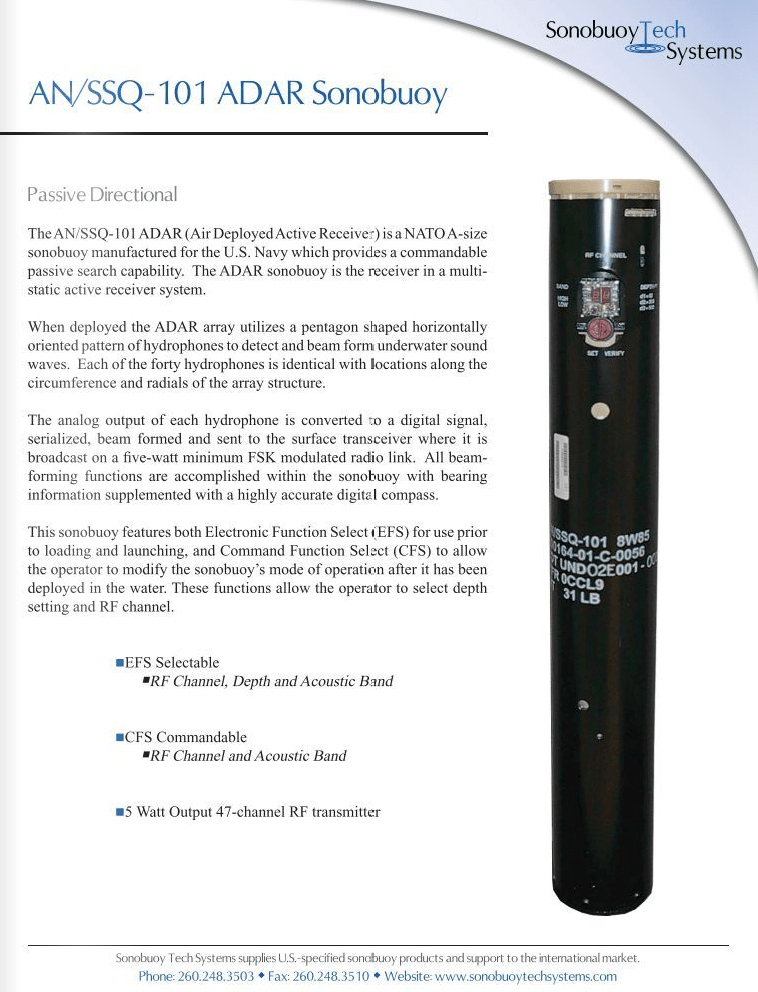 The ADAR sonobuoy is an expendable unit capable of receiving UHF downlink commands and sending real-time beamformed acoustic data via a VHF digital uplink to the monitoring unit. The ADAR will be a free-floating acoustic data receiver that will operate in conjunction with an acoustic source. The buoy will also scuttle automatically upon detection of a low voltage state or completion of its six-hour life.The ADAR is expended by all compatible ASW aircraft or OTS by shipboard personnel and operated in conjunction with an independent transmitting acoustic source. The EFS selector is used to select depth (one of three) and the default acoustic beamform band (one of two).