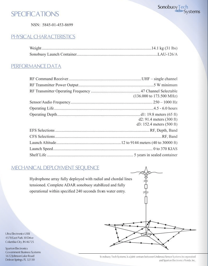Once it hits the water, the sonobuoy packed inside breaks into sections that drop down further into the water and it ultimately deploys a massive pentagram-shaped hydrophone array consisting of a whopping 40 hydrophones. It takes around 240 seconds, or four minutes, for the entire array to deploy and become fully operational. Once it is, and other active sonar systems are in use, it can provide very accurate location info of a target.