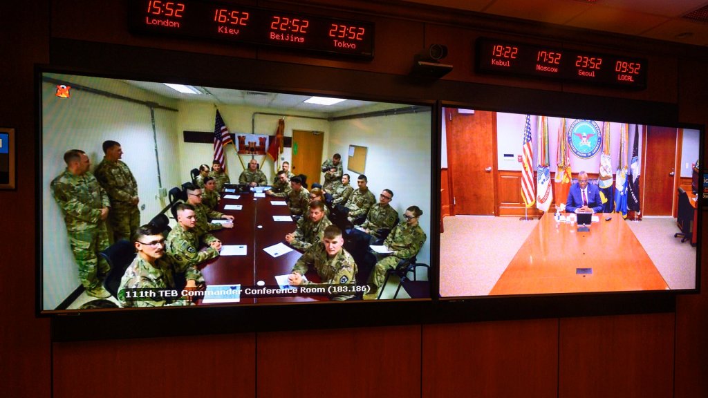 In this week’s top shot, U.S. Secretary of Defense Lloyd Austin speaks via video teleconference with soldiers from the Army’s 111th Theater Engineer Brigade at Camp Buehring in Kuwait on 24 November. The SECDEF tweeted the picture, noting that he wanted to thank the engineers for “leading over 650 projects, not the least of which [was] building a camp to house 5000+ Afghan refugees!”