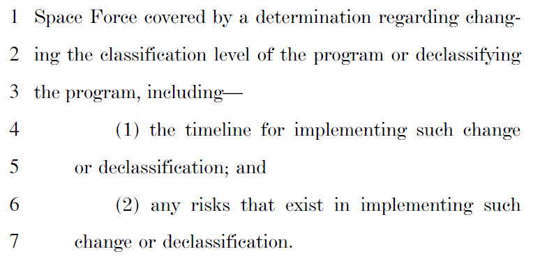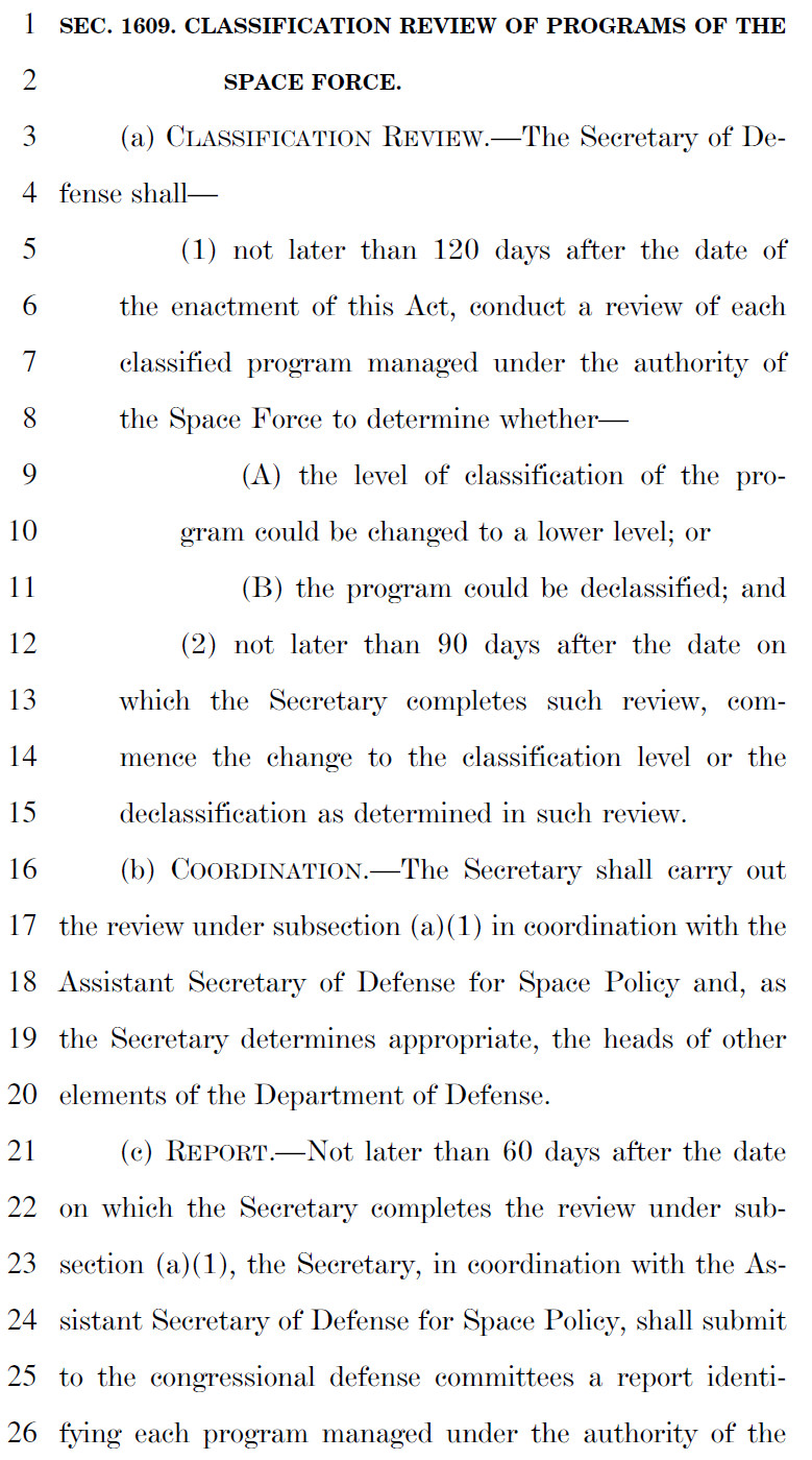Section 1609 of this new draft NDAA calls for the Secretary of Defense to, “not later than 120 days after the date of the enactment of this Act, conduct a review of each classified program managed under the authority of the Space Force” to see if the classification level of any of those programs could be lower or if they could be declassified entirely. Then, “not later than 90 days after the date on which the Secretary completes such review, commence the change to the classification level or the declassification as determined in such review.”