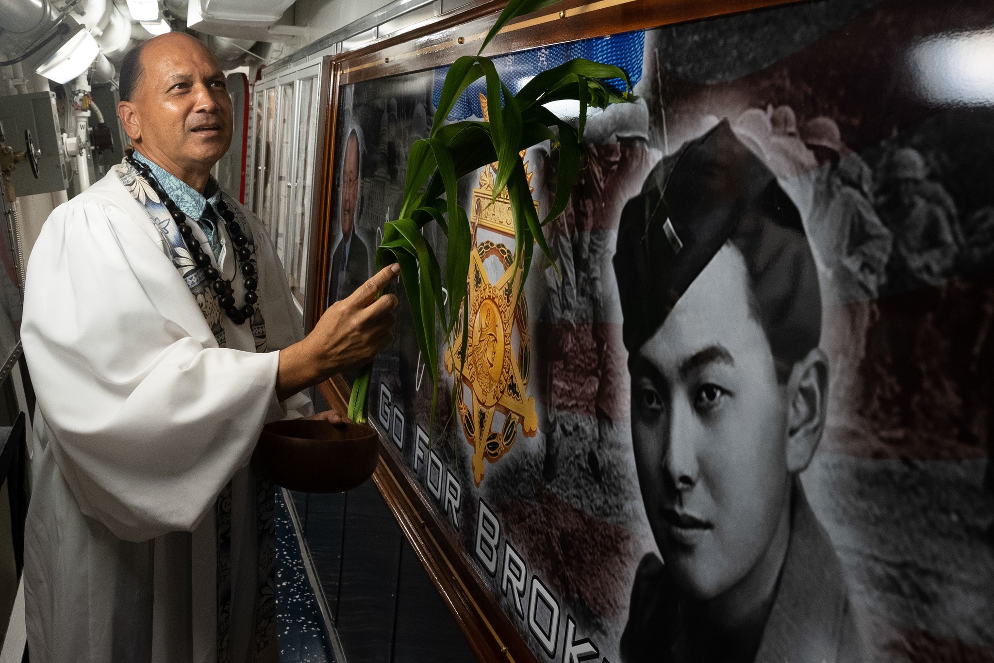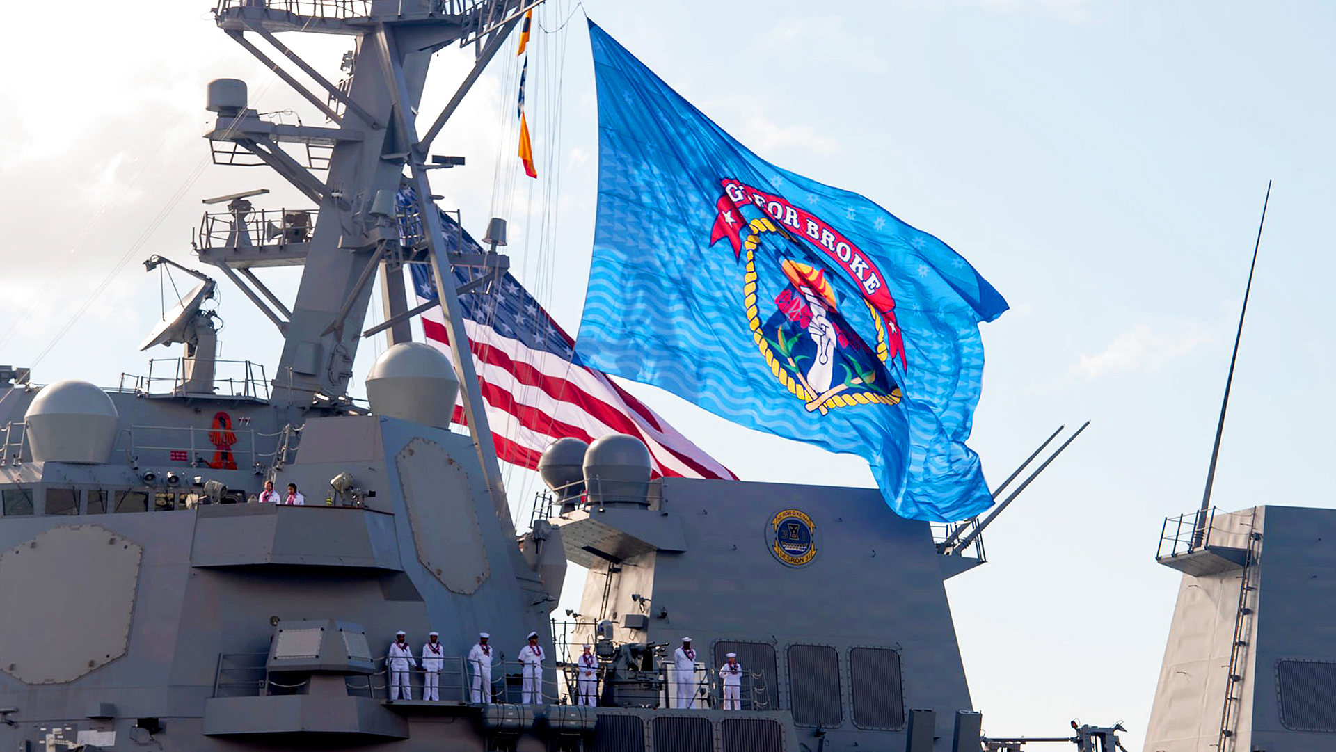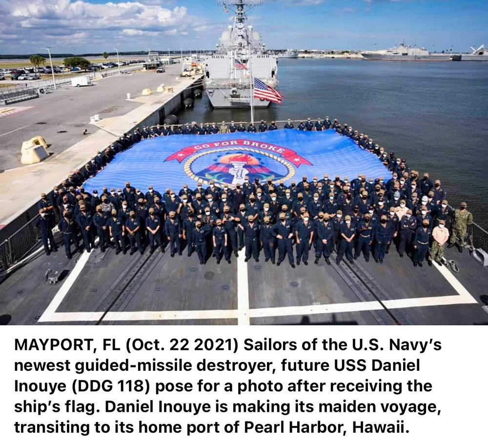 Inouye’s service during World War II is even more notable as he served with the highly decorated 442nd Regimental Combat Team, a unit made up entirely of soldiers of Japanese descent. And that is where the motto “Go For Broke” on the giant blue flag DDG-118 was seen flying at its commissioning came from, it’s the same as the 442nd Regimental Combat Team’s motto. The torch is also from the 442nd’s insignia.