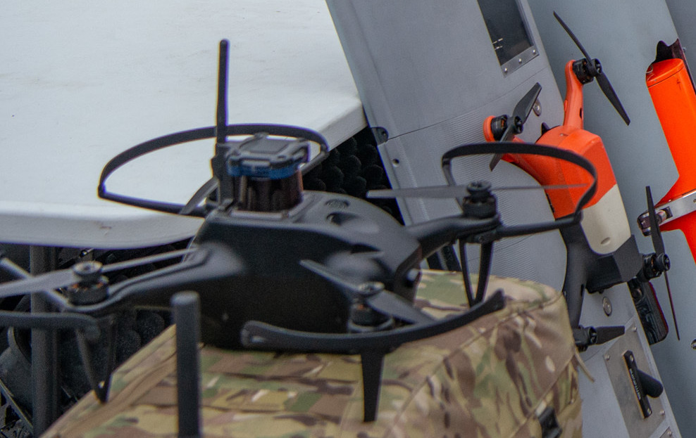 It is unclear whether or not this particular system can recover the smaller drone in flight after it completes its mission, but it seems unlikely from what we can see. The exact kinds of quadcopters it is designed to deploy are not immediately clear, but the one loaded onto it for the display certainly shares a general look of various commercially available types that are typically fitted with various types of small video cameras. It does appear to be smaller than the current generation ShieldAI Nova quadcopter, which is seen on display on a nearby table, has visual similarities to older Nova types. Nova-series quadcopters have been in use by Navy special operators for years now.
