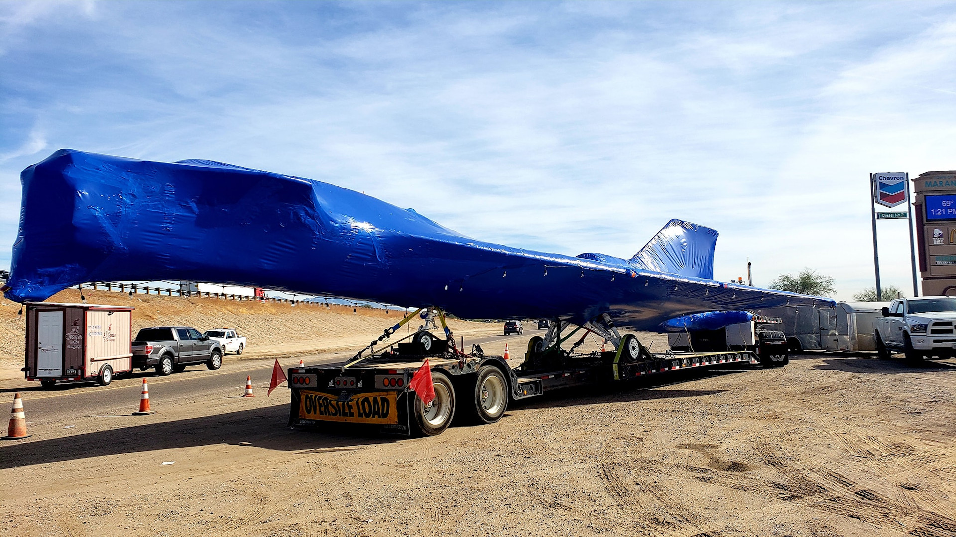 Photographer Aldo Boccaccio grabbed pictures of the aircraft under wraps on a semi-trailer in Marana, Arizona earlier this week and was kind enough to share them with us. The plane has been under construction at Skunk Work’s facility at the U.S. Air Force’s Plant 42 in Palmdale, California, since 2018. Lockheed Martin confirmed to The War Zone that the current plan is to truck the X-59 to its Texas plant, which is best known for hosting the F-35 Joint Strike Fighter assembly line, for structural tests before bringing it back to Palmdale for the initial round of flight testing. It does seem somewhat curious that such a fragile, one-off design would be moved via road instead of something like a U.S. Air Force C-5 Galaxy transport plane.