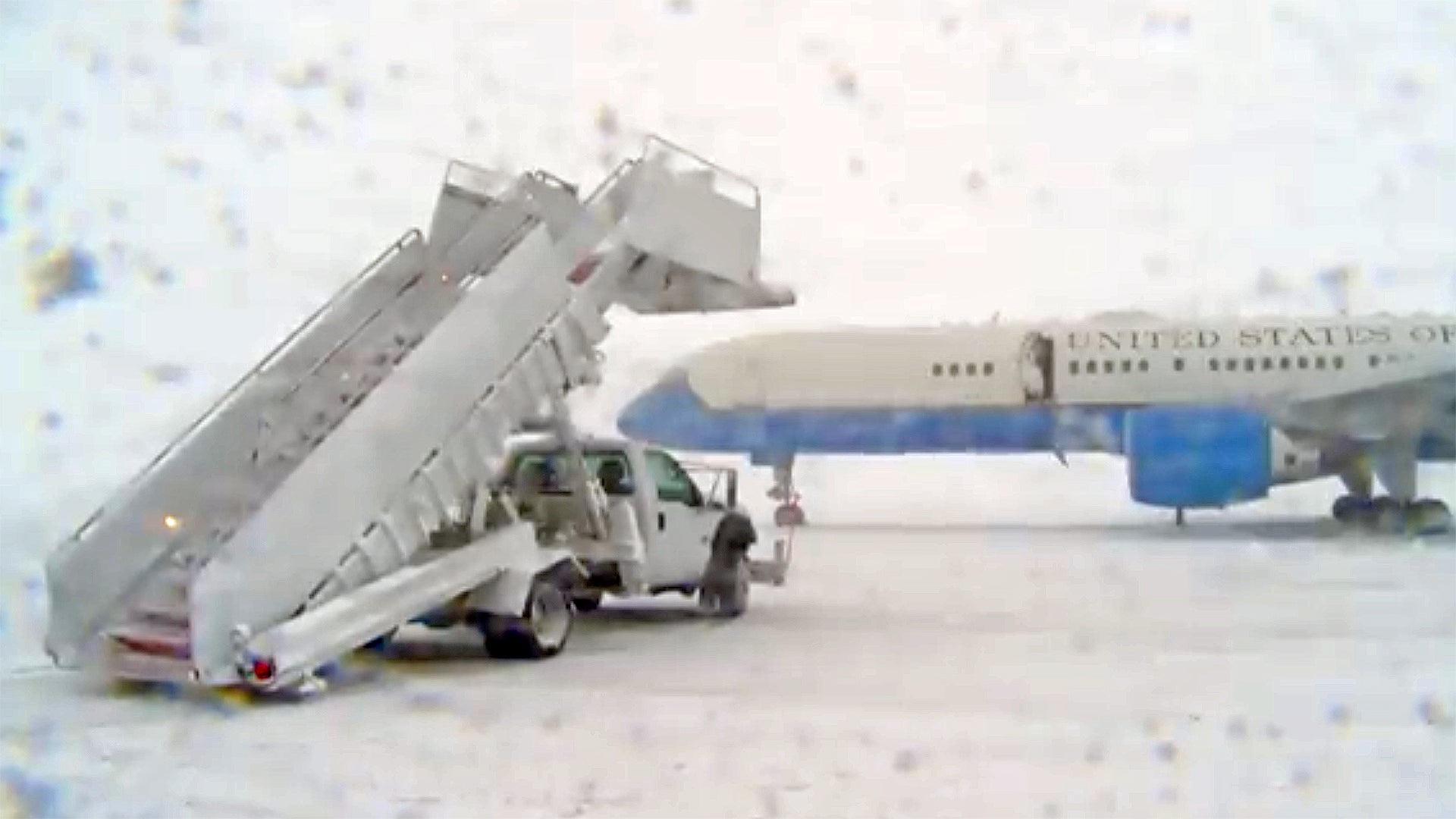 A snowstorm in the Washington, D.C., area left U.S. President Joe Biden, as well as other members of his entourage, briefly stuck on a U.S. Air Force C-32A jet at Andrews Air Force Base in Maryland this morning. Once the President was able to deplane, he had to take a motorcade to the White House since the weather was too severe for ‘Marine One’ helicopters to fly him there.