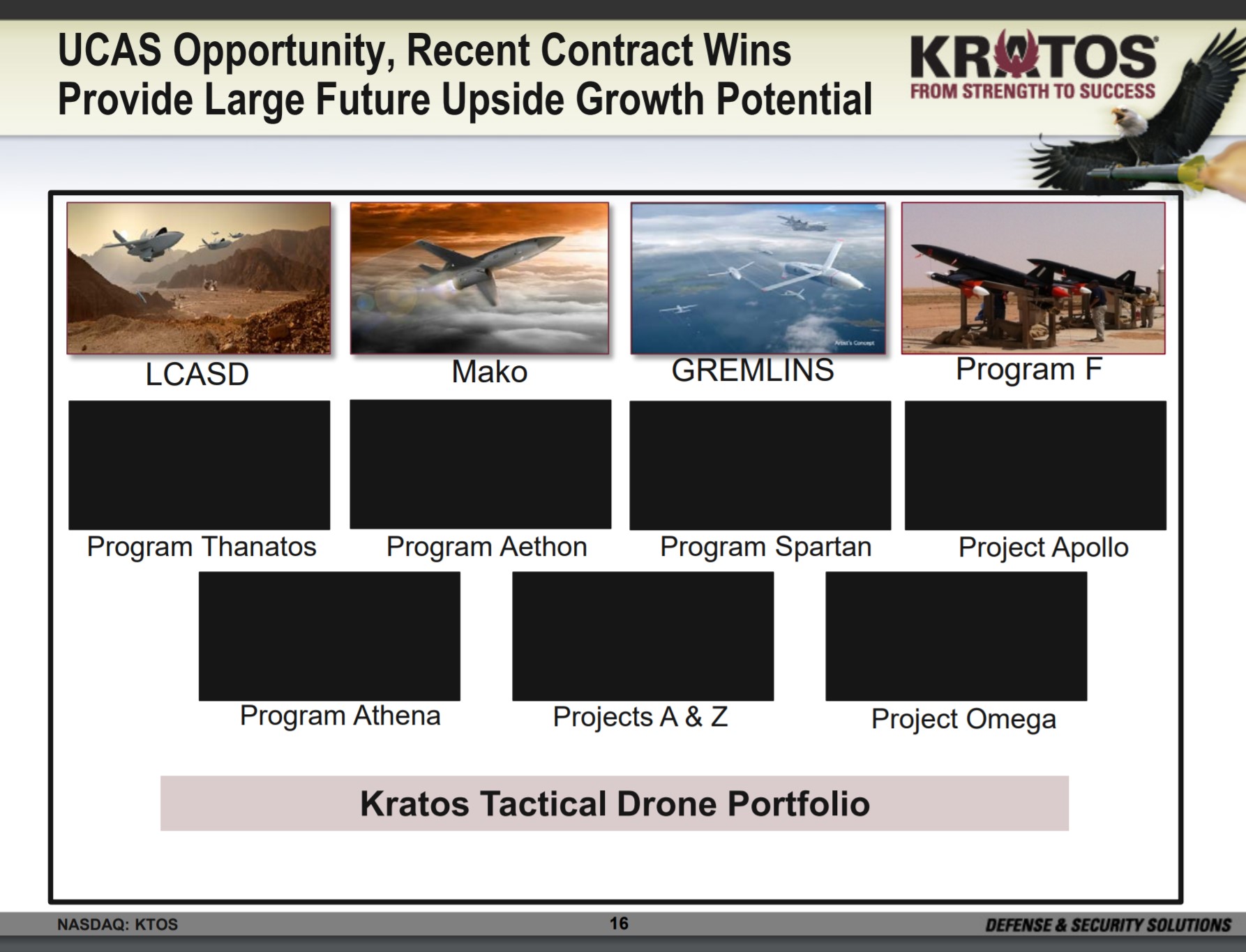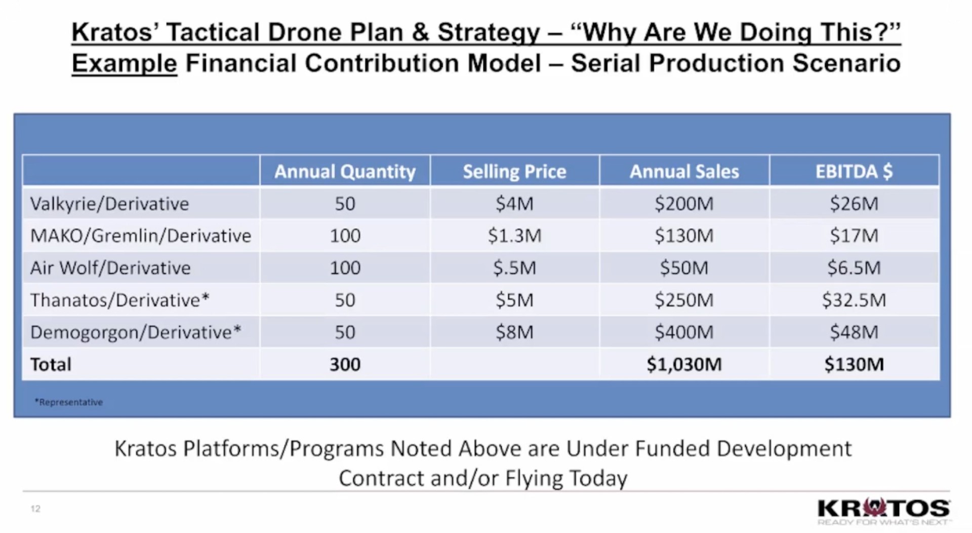 The slide released as part of an investor brief is the first known mention of the Demogorgon program. It states that the Demogorgon drone will have a production price of $8 million a unit with a projected annual production run of 50, potentially bringing in $400 million in annual sales. The slide includes several other Kratos drone programs including the XQ-58 Valkyrie, the air-launched Gremlin, UTAP-22 Mako, the Air Wolf “tactical” drone, and two programs not yet revealed to the public: Thanatos and Demogorgon. The name “Thanatos” has previously appeared in Kratos publications, although there are no further additional details about the program.