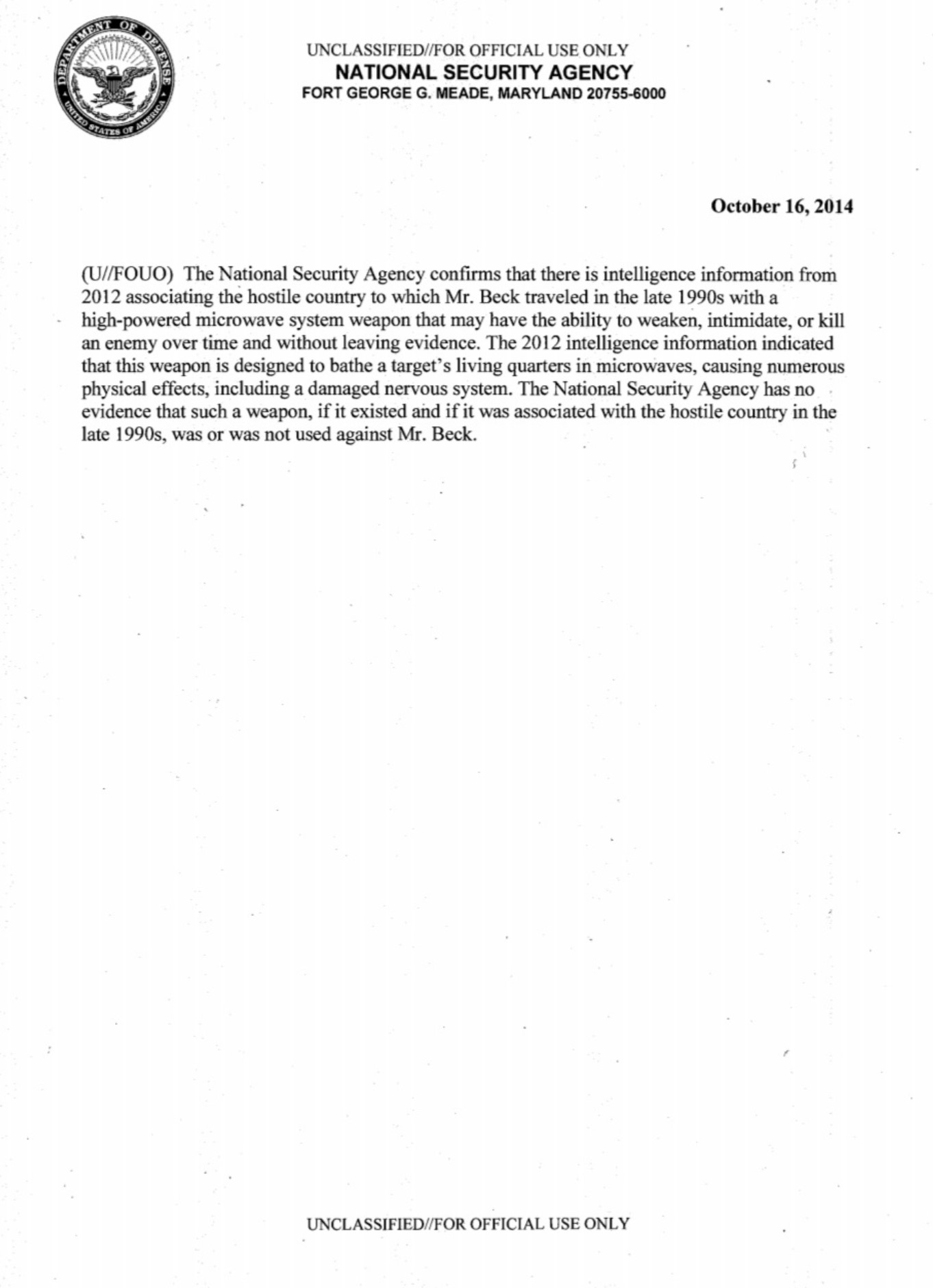 Nevertheless, at least one lawsuit has already been filed against the CIA after the release of their recent report on behalf of Mike Beck, a former counterintelligence officer with the National Security Agency who says he was targeted with a microwave weapon while working overseas on behalf of the agency in 1996. The NSA released a memo in 2014, seen below, seeming to confirm that there was at least intelligence associating such a weapon with “the hostile country to which Mr. Beck traveled in the late 1990s.”
