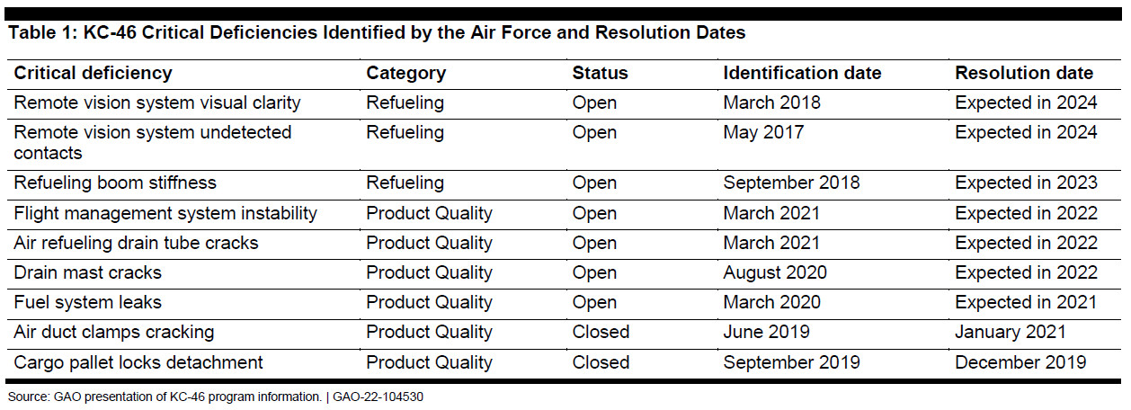 As of last year, there were currently seven unresolved issues with the KC-46A that the Air Force categorizes as critical deficiencies, according to GAO. Boeing and the Air Force expected fixes for continuing issues relating to instability with the flight management system, cracking in the air refueling drain tubes and in separate drain masts, and fuel system leaks, to start being integrated into existing and new production aircraft between 2021 and 2022.