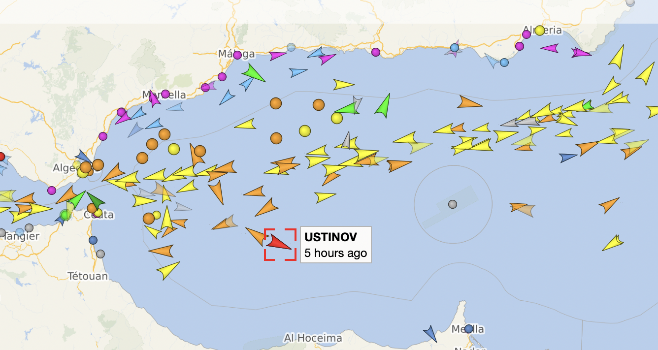 Marshal Ustinov reportedly passed through the Strait of Gibraltar yesterday and Automated Information System (AIS) transmissions provided by VesselFinder and MarineTraffic appear to confirm that it’s now in the Mediterranean. It should be noted that AIS transmissions can be faked, and have been in the past, but at least some analysts consider it at least highly credible that these are genuine.
