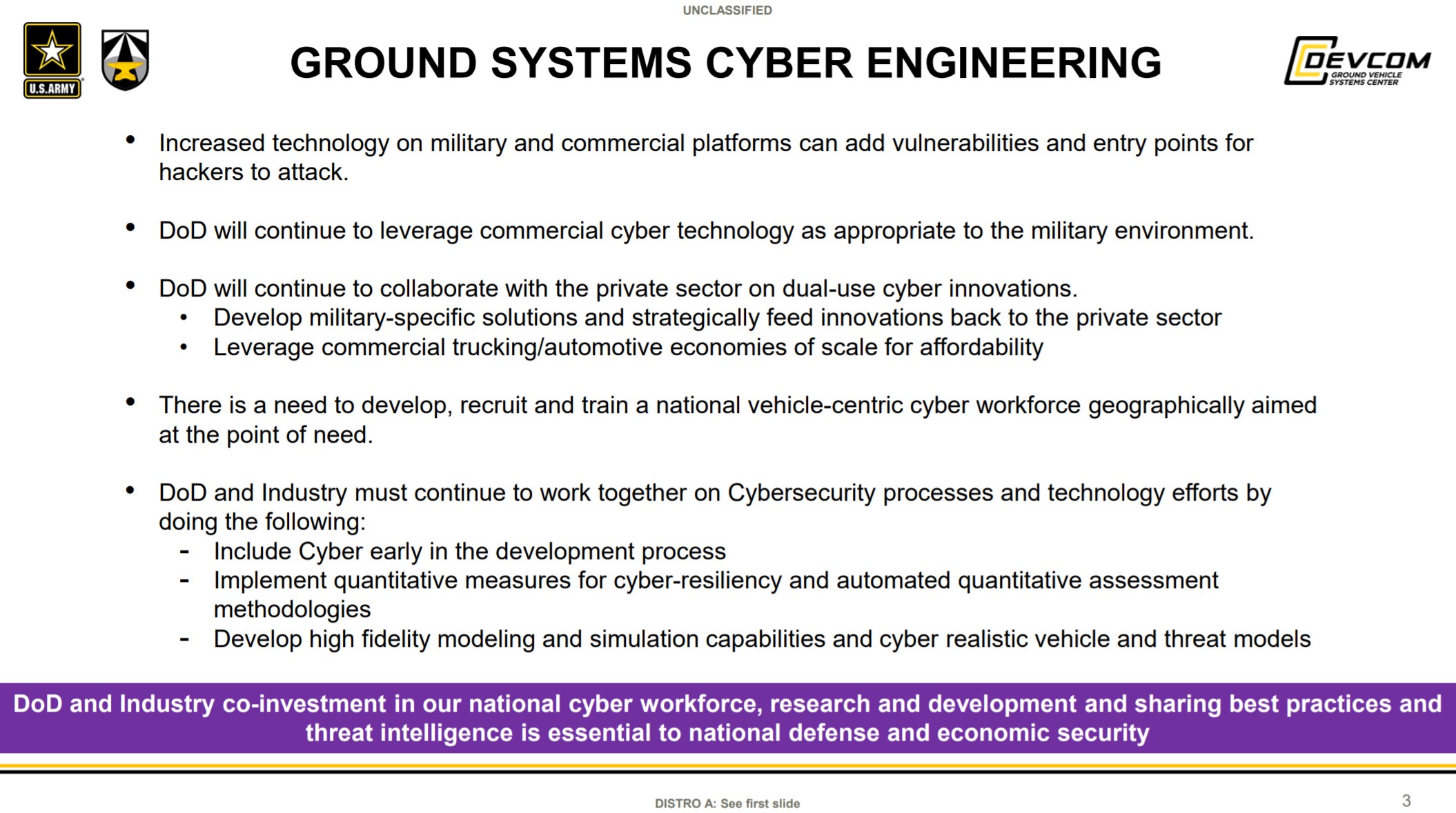 “Plain and simple: vehicles are susceptible to cyberattack,” said Jeffery Jaczkowski, associate director for GVSC’s ground systems cyber engineering, in a video released along with the announcement. “If you think about it, a vehicle today is just a bunch of computers on wheels or tracks. In recent news, there are countless instances of cyberattacks where either data or identity are stolen and similarly, attacks can occur on a vehicle.”