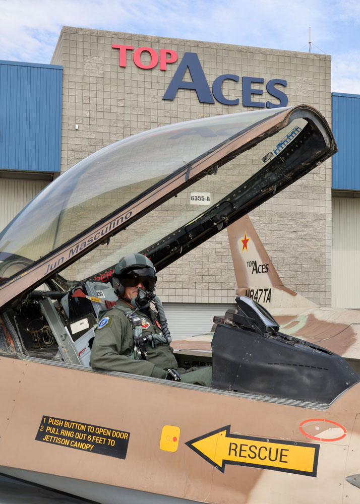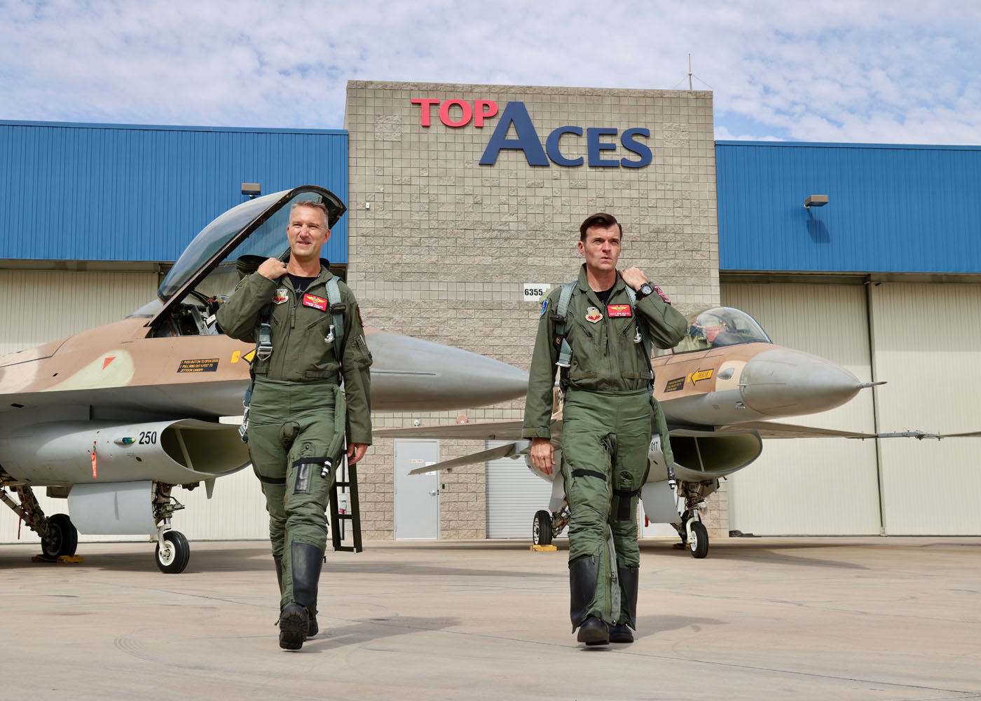 Unlike USAF F-16s, which often fly with advanced targeting pods and large external fuel tanks, Top Aces F-16s are currently flown clean with no external pods or tanks. The F-16 was originally envisioned as a lightweight daytime fighter. Wilson stated “flying the F-16 clean is flying it like it was designed. It is a fighter pilot’s aircraft and it’s incredibly rewarding, providing a lower radar cross-section and it is difficult to see head-on at the merge.” In a clean configuration, the F-16 can get an hour and a half airborne time for its customers.