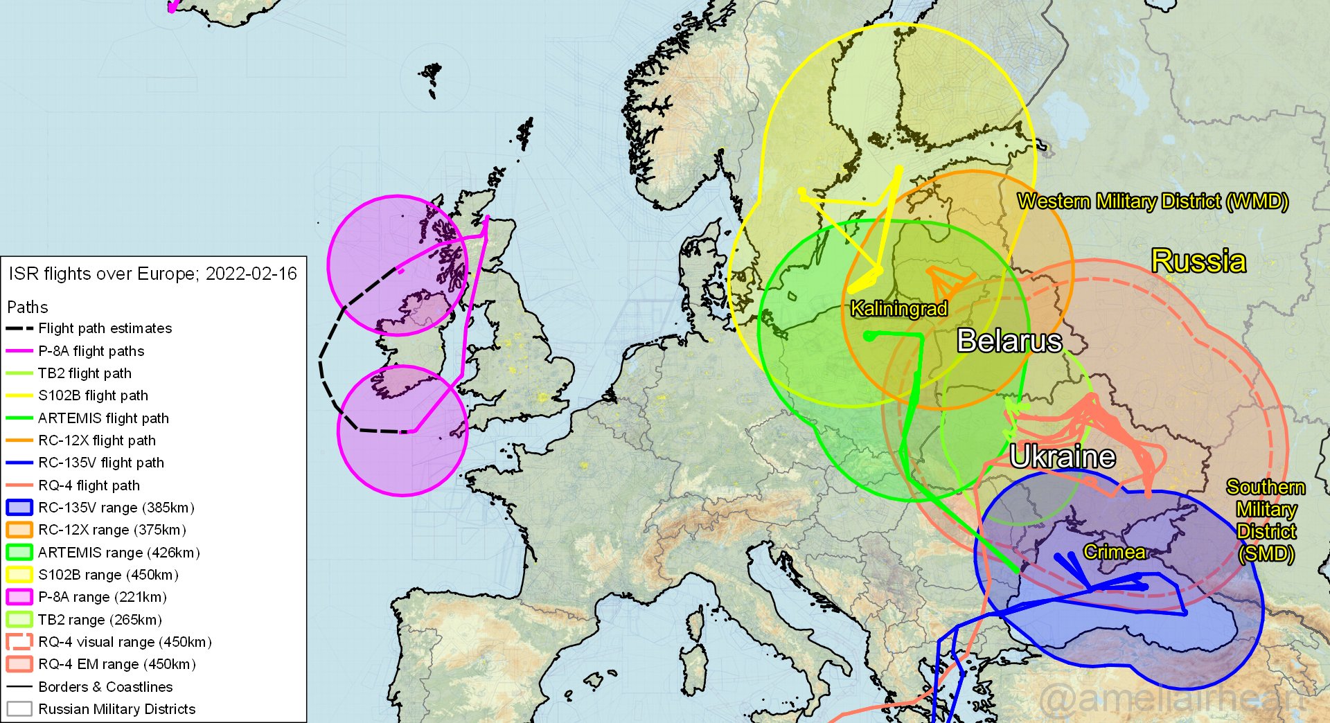 The airborne intelligence, surveillance, and reconnaissance situation over Europe as of yesterday, February 17, as collated by Amelia Smith:
