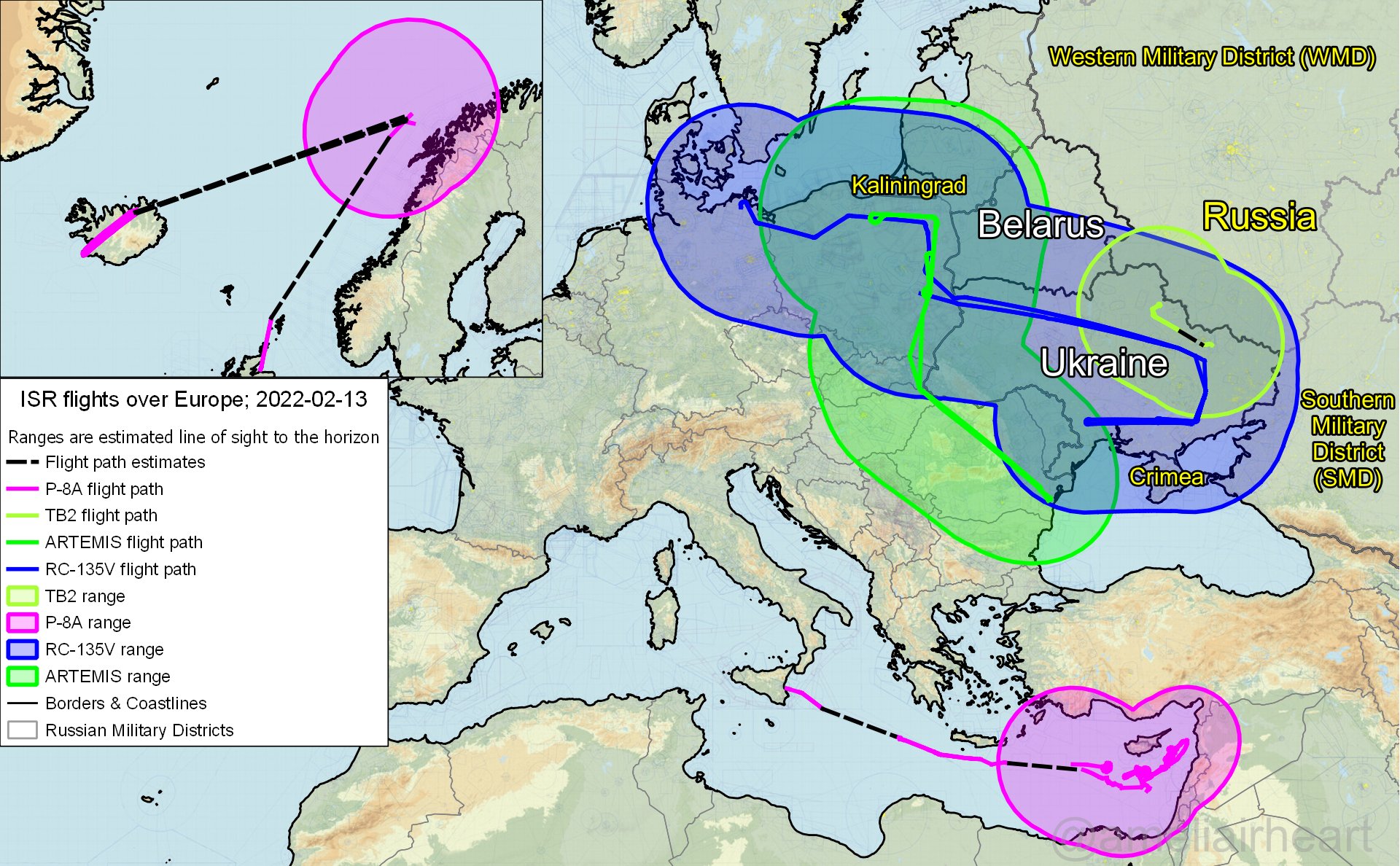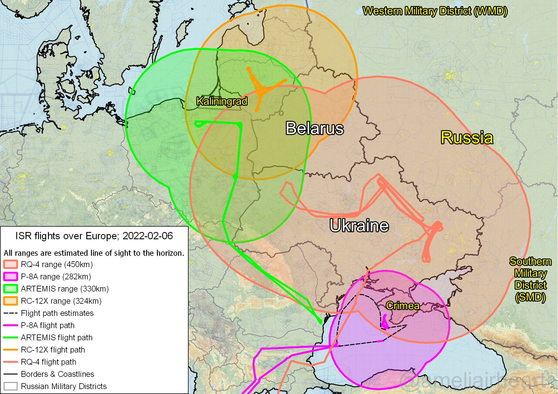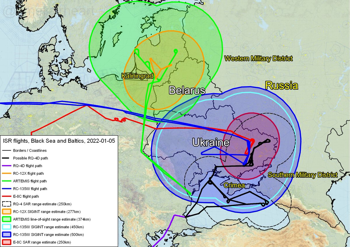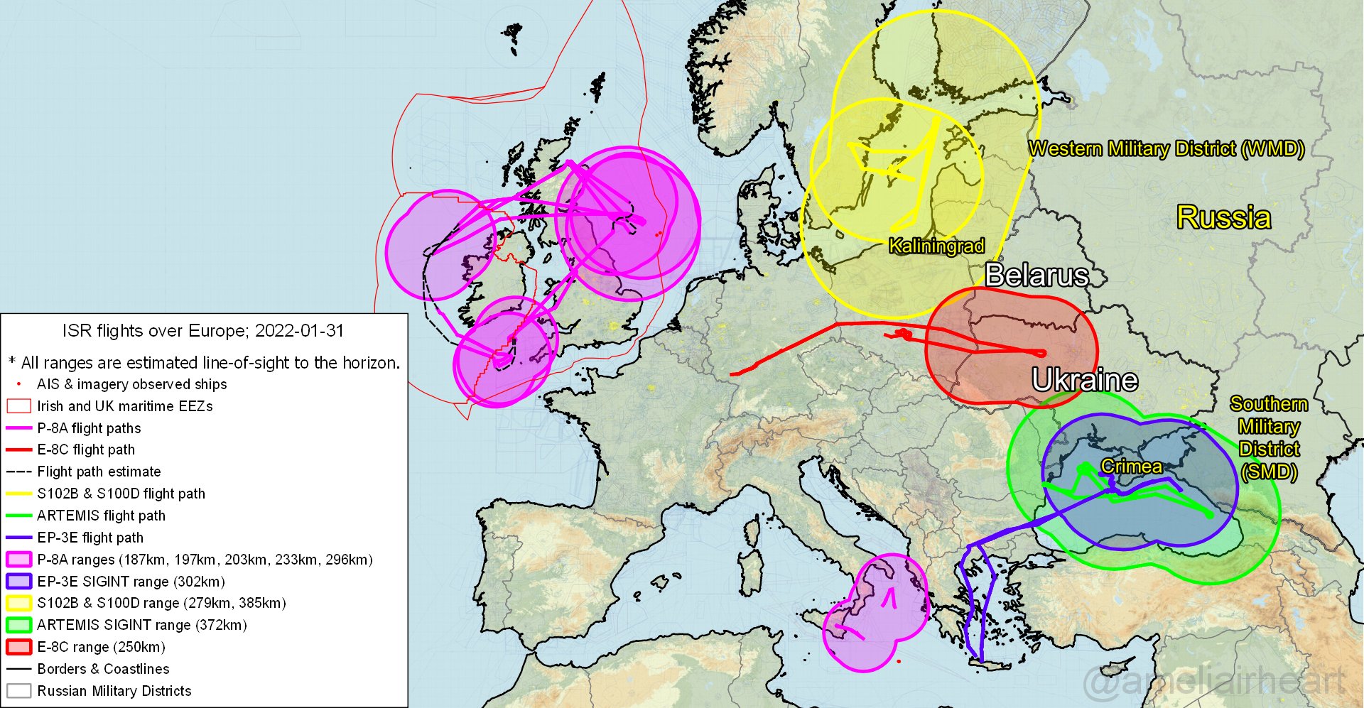 Much, but by no means all of the aerial intel-gathering activities can be tracked in real-time using publicly available flight-tracking software and a growing cadre of open-source intelligence collectors who devote much time to making sense of these aircraft movements. These include Amelia Smith, or @ameliairheart, whose maps with overlaid flight paths and estimated sensor ranges appear in this article.