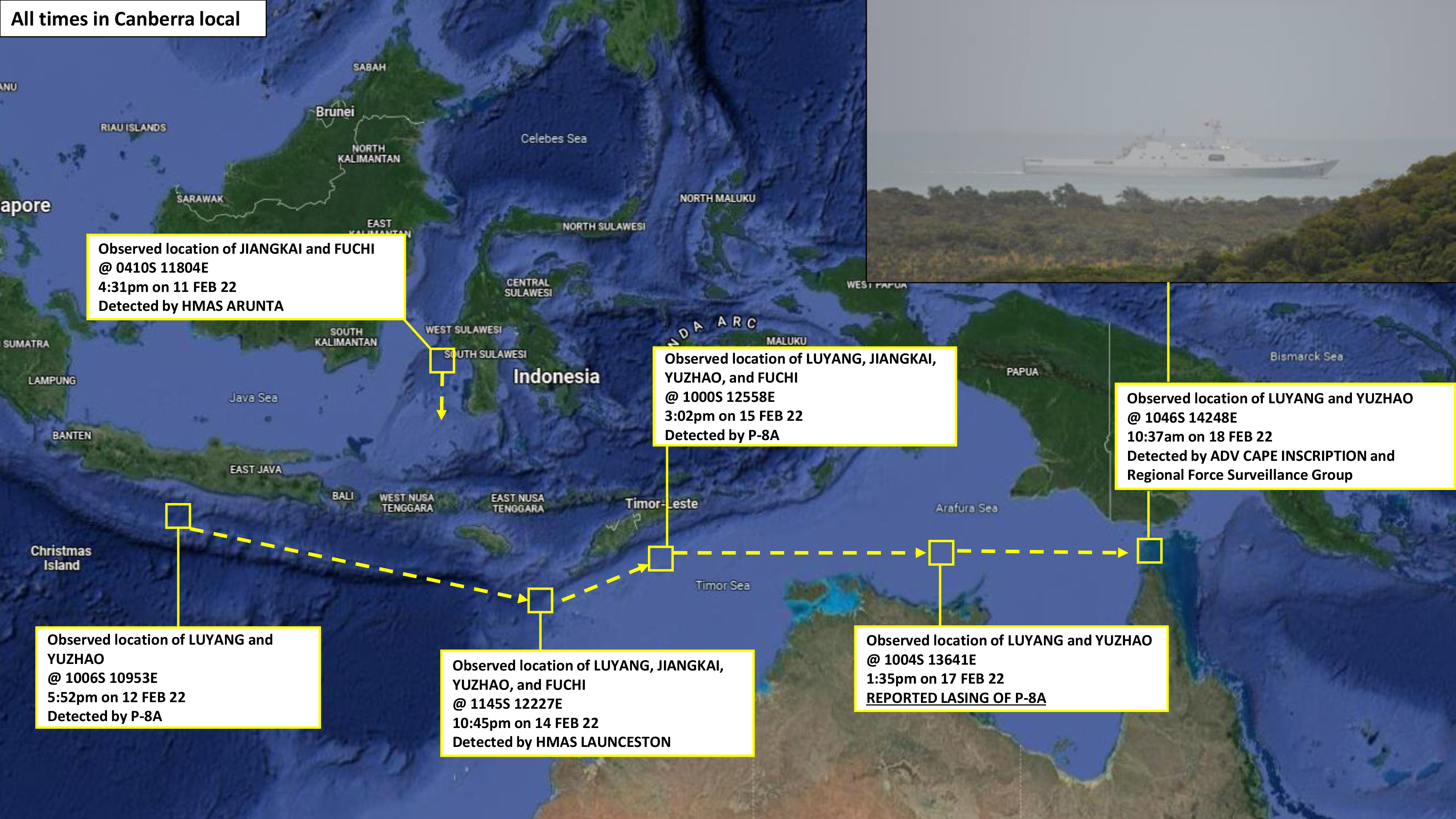 According to a report in The Age newspaper, the Australian Ministry of Defense photo showing the moment the laser was aimed at the P-8 was captured by the Royal Australian Navy’s Anzac class destroyer HMAS Arunta, although this cannot be confirmed. As of February 11, this RAN warship was shadowing two other PLAN vessels off South Sulawesi, Indonesia, and then appears to have headed south to follow Jinggang Shan and Hefei.