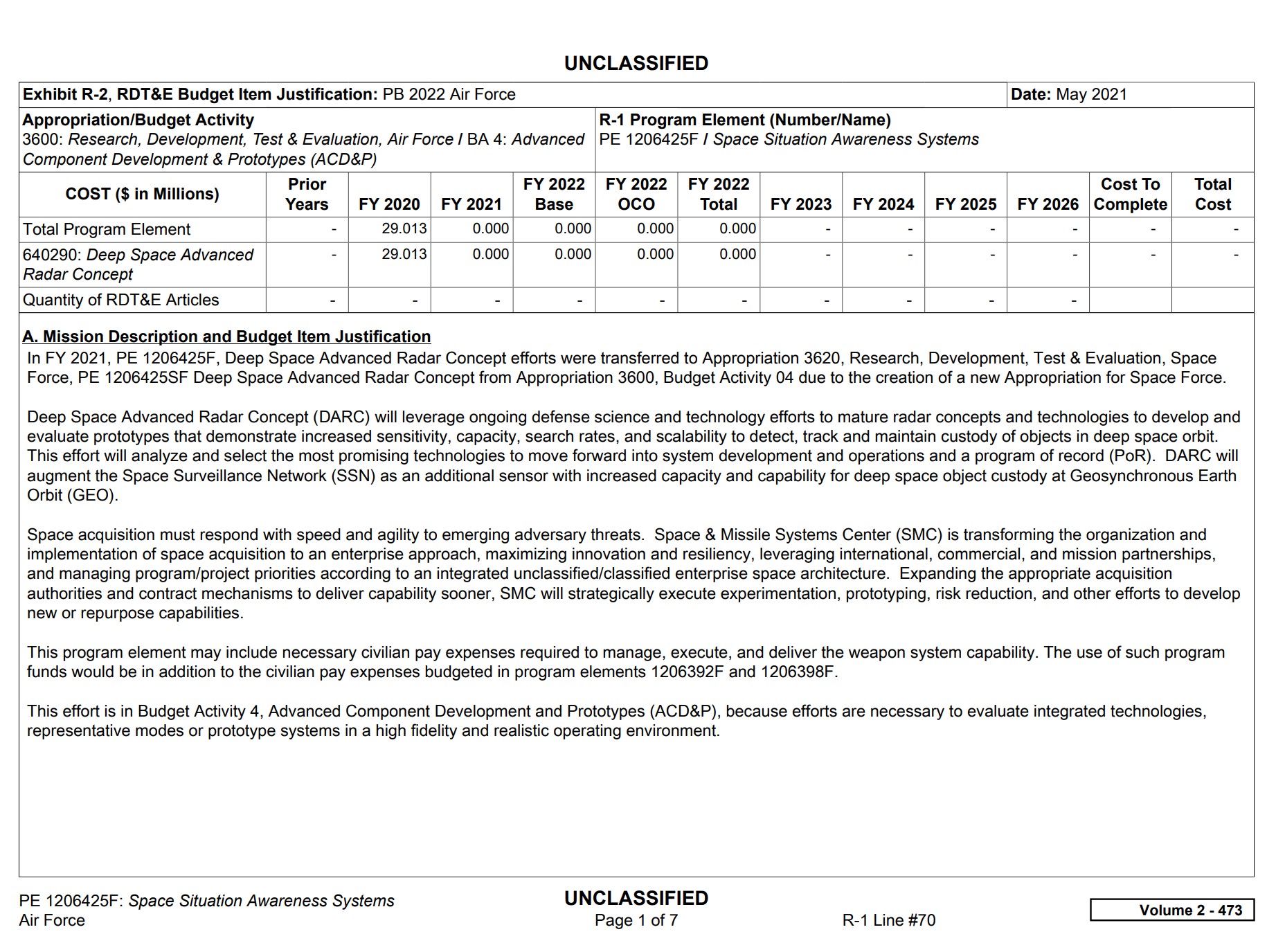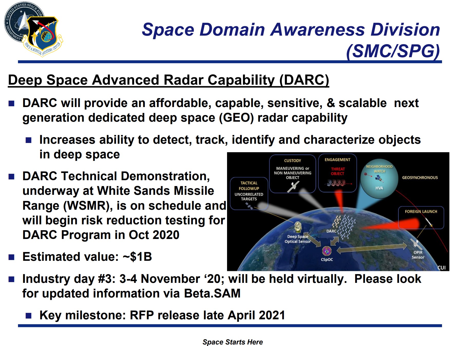 A Northrop Grumman press release published today states that the $341 million contract with Space Force’s Space Systems Command (SSC) is to develop a prototype radar system for DARC Site 1, the first of three planned DARC installations. The first system is projected to be delivered in 2025 to an undetermined location in the Indo-Pacific region. Space Force is also eyeing locations in the United Kingdom and the continental U.S. for two additional DARC sites, planned for 2024 and 2025, respectively. Together, the three sites are projected to cost $1 billion, SpaceNews reports.