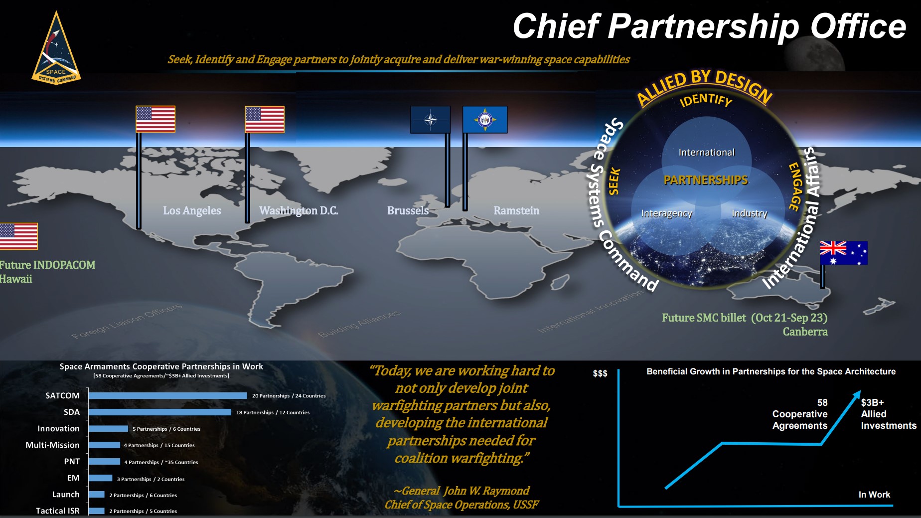 In yesterday’s Space Force press release, Greiner states that DARC is “a testament to our ‘Allied by Design’ approach where working in close collaboration and cooperation with our closest allies will produce a mutually beneficial partnership.” Space Force leaders have been outlining this “allied by design” concept in recent years in order to strengthen combined space capabilities along with allied nations. Deanna Ryals, chief of international programs at Space and Missiles Systems Center, stated last year that “everything that we are going to do to build a satcom [satellite communications] enterprise within the US Space Force is going to be done through ‘allied by design’” and that “everything that we do will be with international partners.”