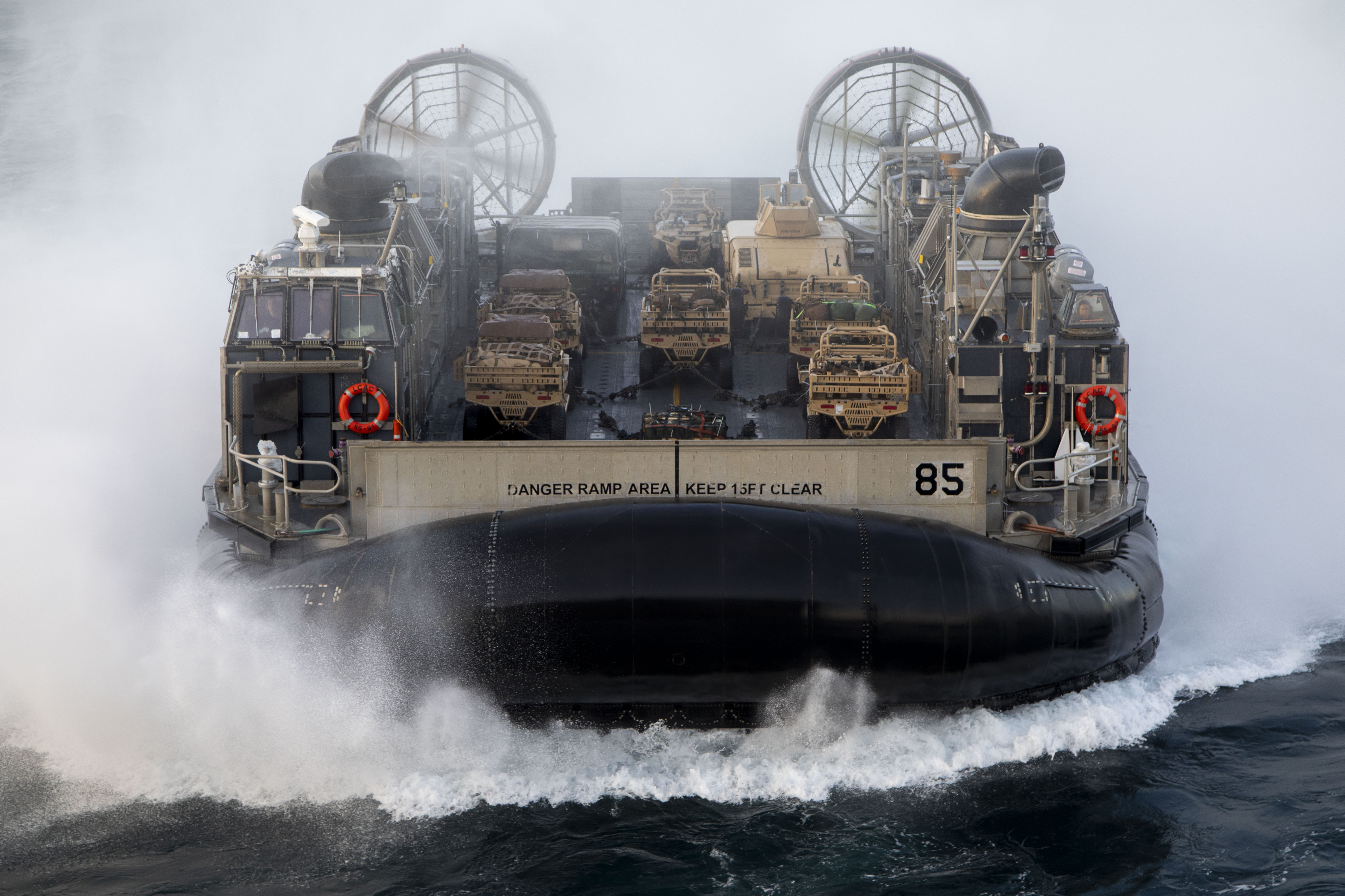The LCAC has a maximum speed of over 40 knots when traveling with a full load and a range of 200 miles under normal conditions. This gives the craft capability to launch over-the-horizon amphibious assaults, keeping the vessels they are launched from farther from contested or denied areas. The craft has two gun mounts that can house M2 .50 caliber or M240 7.62mm machine guns in addition to MK-19 40mm grenade launchers.