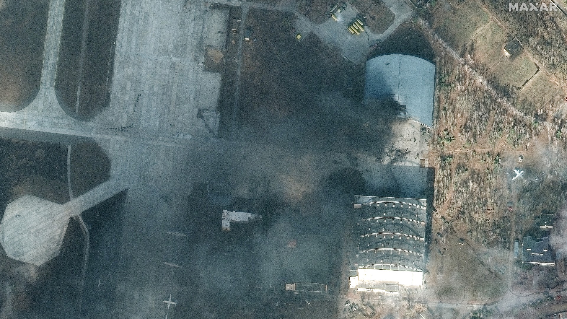 Additional satellite images, in this case, taken by Maxar on February 27th, show the destruction at the airport, including to the large shelter where the An-225 was supposedly stored: