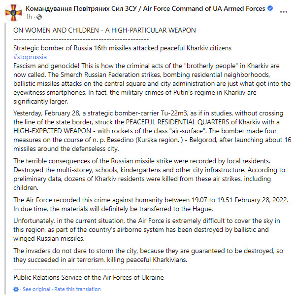 The Ukrainian Air Force says that at least one Russian Tu-22M Backfire bomber was involved in the strike on Kharkiv on February 28.